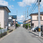 住宅地内道路の夜景写真です。LED防犯灯がコンクリート柱に設置されています。アカルミナ色(8,000K)のLED防犯灯を設置することで、道路を挟んだ防犯灯と反対側の白いガードレールに対しても認識しやすい空間になっています。