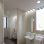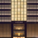 〔都市の行灯〕がコンセプトの外装は日本古来の「和の美」を表現しながらも、全体はガラス建築の透明感を押し出した構成となっています。低層階は簾をモチーフとしたテラコッタルーバーと黒御影の構成であり、上層階はガラスのカーテンウォールに和紙を組合せた仕上げとなっています。