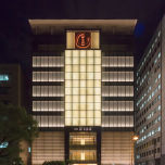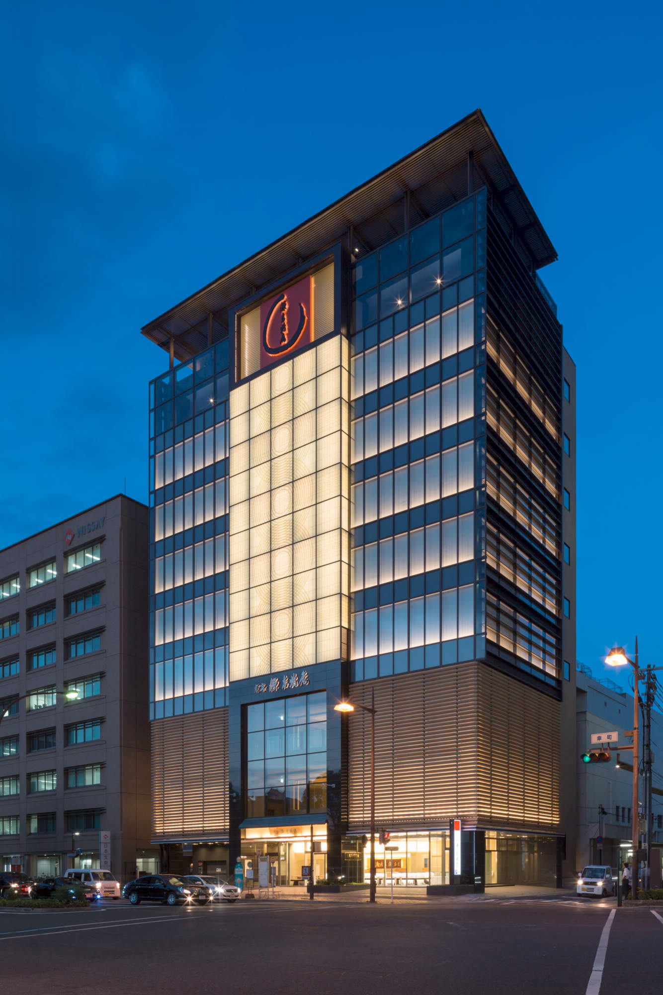 〔都市の行灯〕がコンセプトの外装は日本古来の「和の美」を表現しながらも、全体はガラス建築の透明感を押し出した構成となっています。低層階は簾をモチーフとしたテラコッタルーバーと黒御影の構成であり、上層階はガラスのカーテンウォールに和紙を組合せた仕上げとなっています。