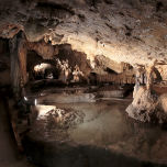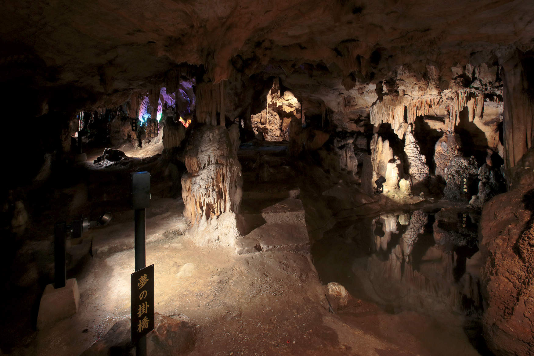 洞内の拠点部位である、千枚田、大黒柱等のライトアップ状況で、LEDライトアップ(NNY24104HLE9温白色)で広角な光により、鍾乳洞の神秘性を演出しています。