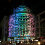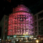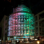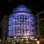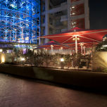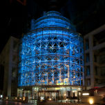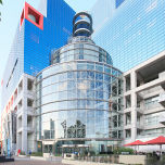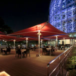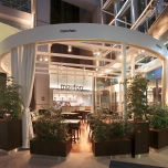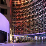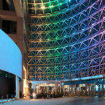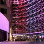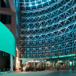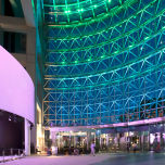 ガラスで覆われた5層吹き抜けアトリウム空間の昼景。壁面トラス構造が特徴。アトリウムには新しくステージ・カフェが増設され、昼から夜まで楽しめるエンターティメント空間として生まれ変わりました。