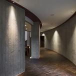 意匠的な天井の構造の合わせ、グレアレスダウンライトにて照度400~500lxを確保しています。R形状の連続的な壁面にもウォールウォッシャーダウンライトにより、均一な光の壁を演出しています。