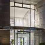 吹抜けのエントランスホールはSmartArchi高Wグレアレスユニバーサルダウンライトにより壁面のテクスチャを浮き上げながら、ホールの奥からあふれだすような光の演出によりエントランスの表情をつくっています。