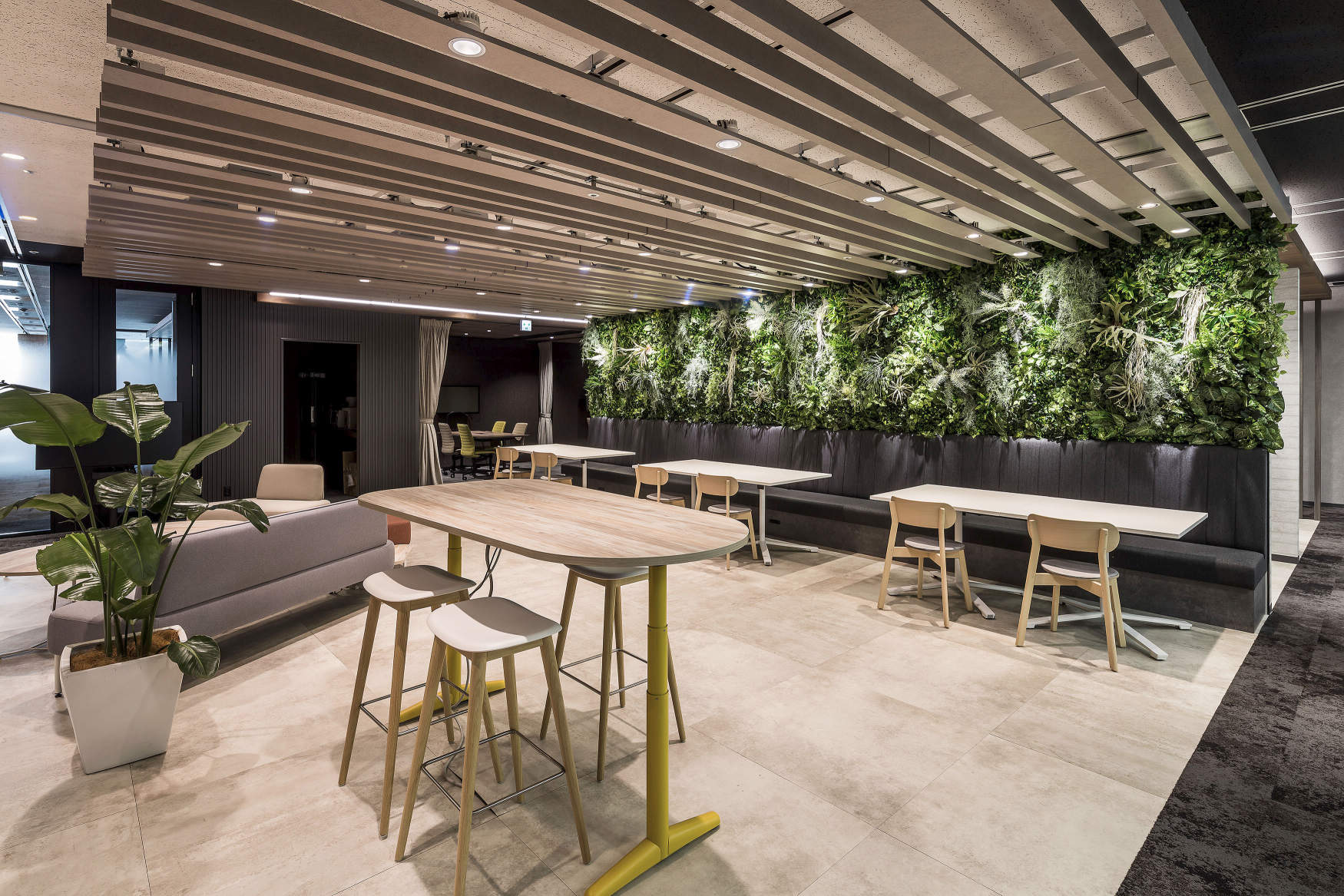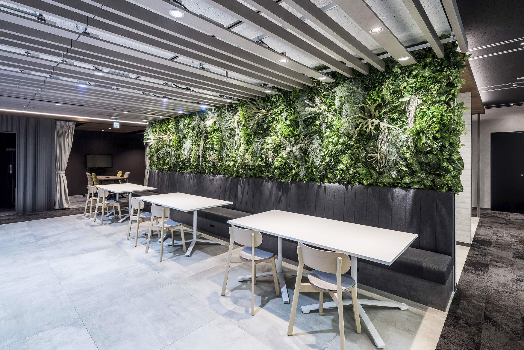 彩光色LEDで壁面の植栽を映えさせる演出もしています。