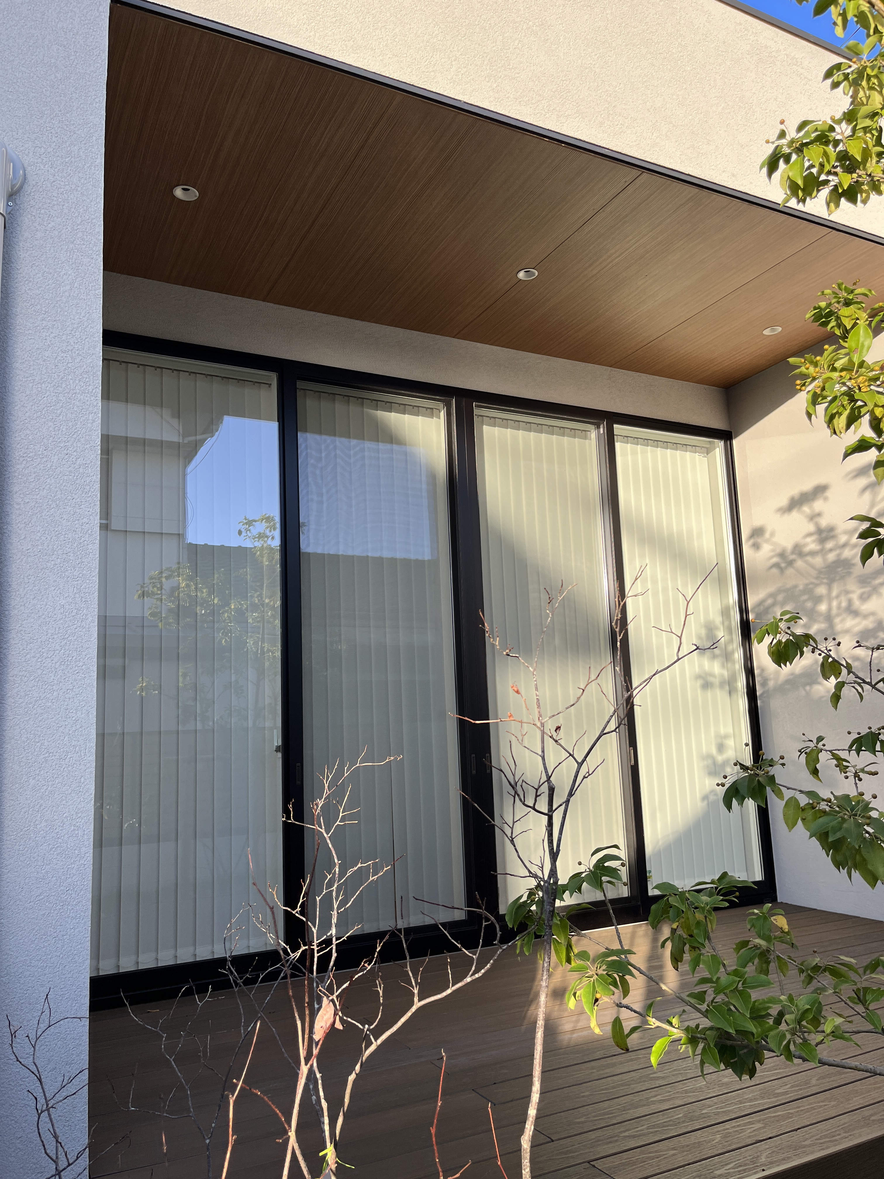 南側の軒天井にはHomeArchiの広角ダウンライトを使用し、デッキ全面を照らす事で屋内から見た際に、部屋をより広く見せる効果を狙っています。