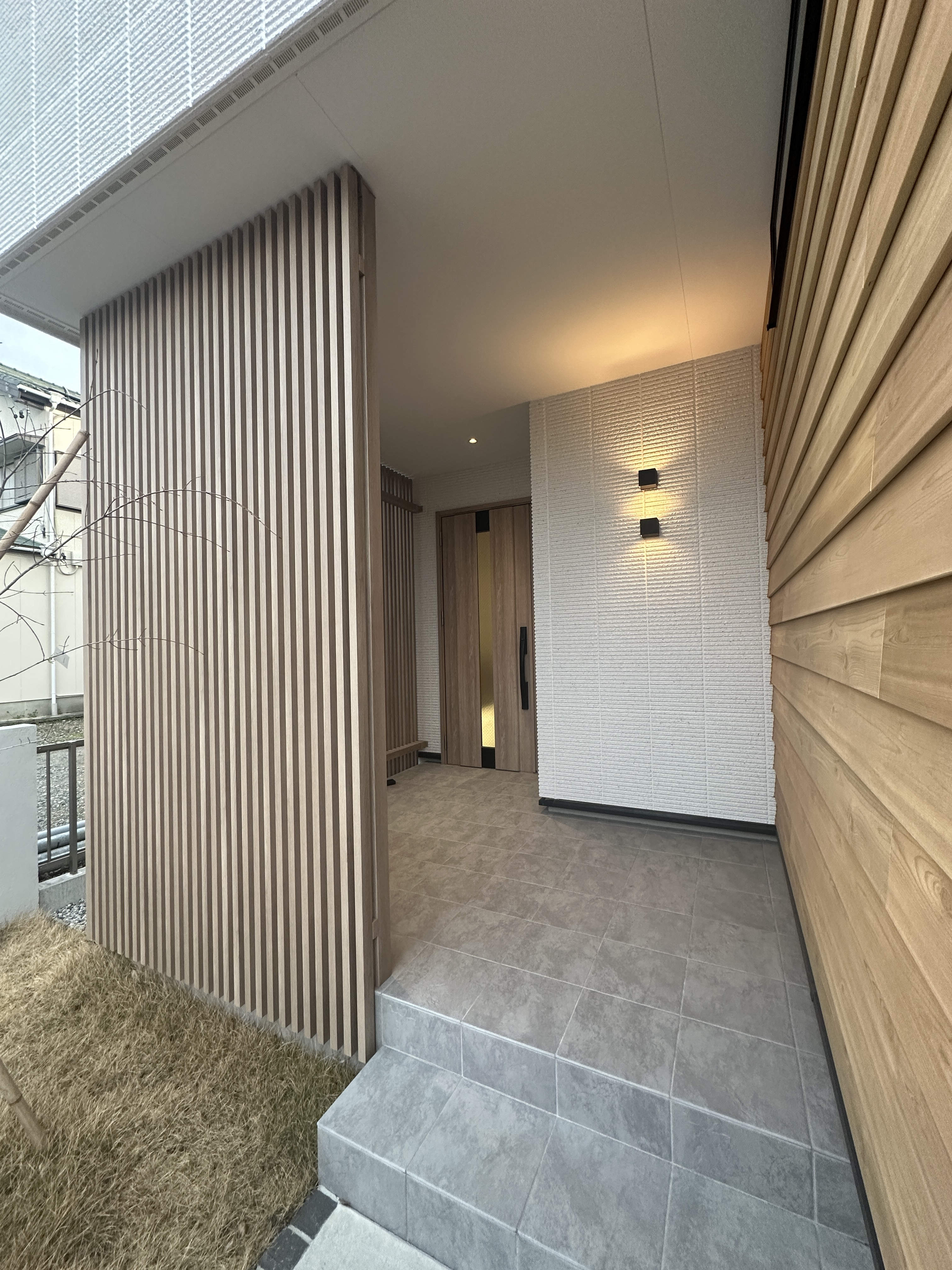 北側の玄関ポーチまでのアプロ―チにHomeArchiの屋外用ブラケットを縦に設置する事で、軒天井までの広がりを強調しています。