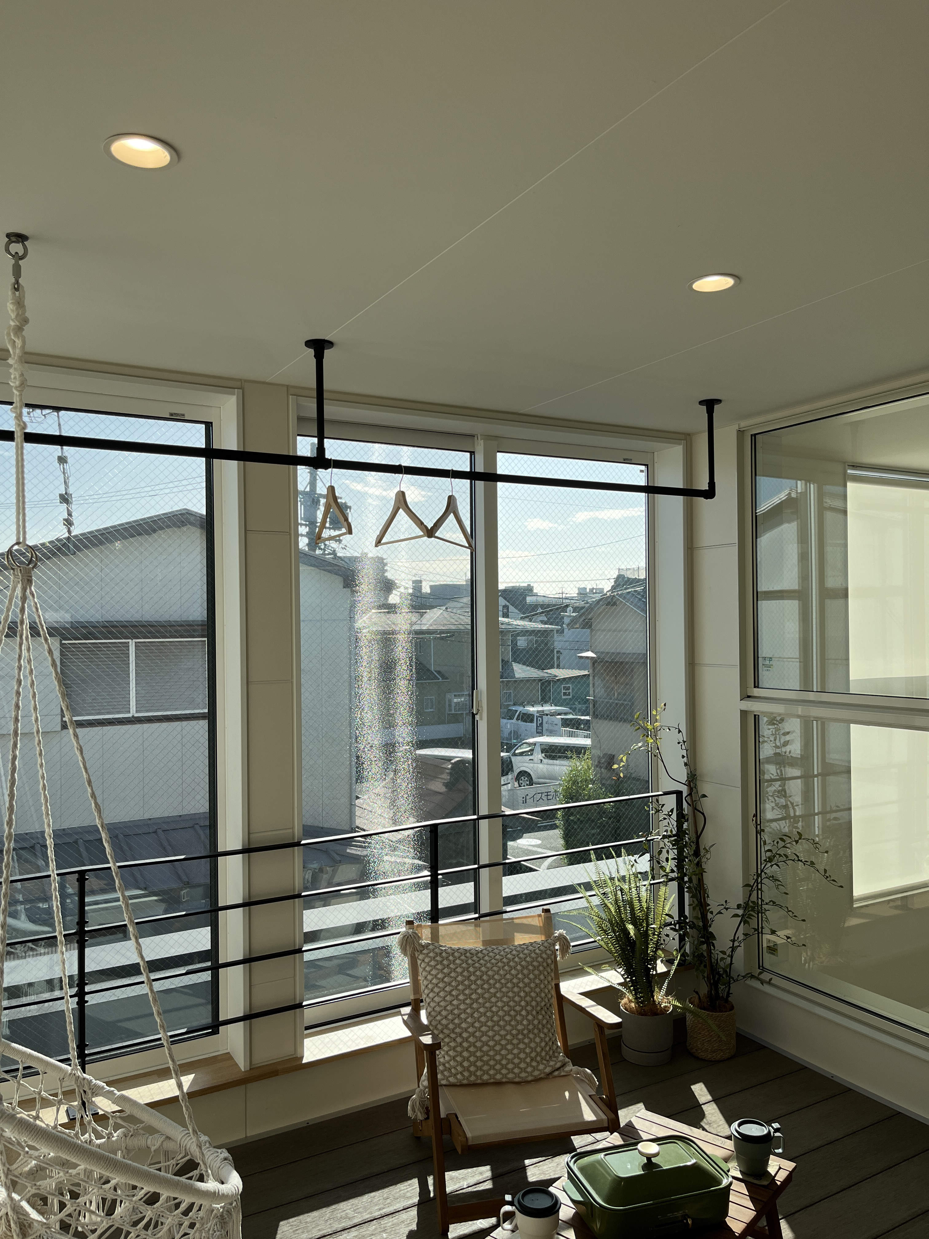 2階ホールは子供の遊べる場として、ボルダリングのホールドが壁に設置されており、その色とりどりな雰囲気に合わせた小型シーリングが空間にマッチしています。天井のダクトレールへのダクトカバーは子供への安全性に配慮されたものです。
