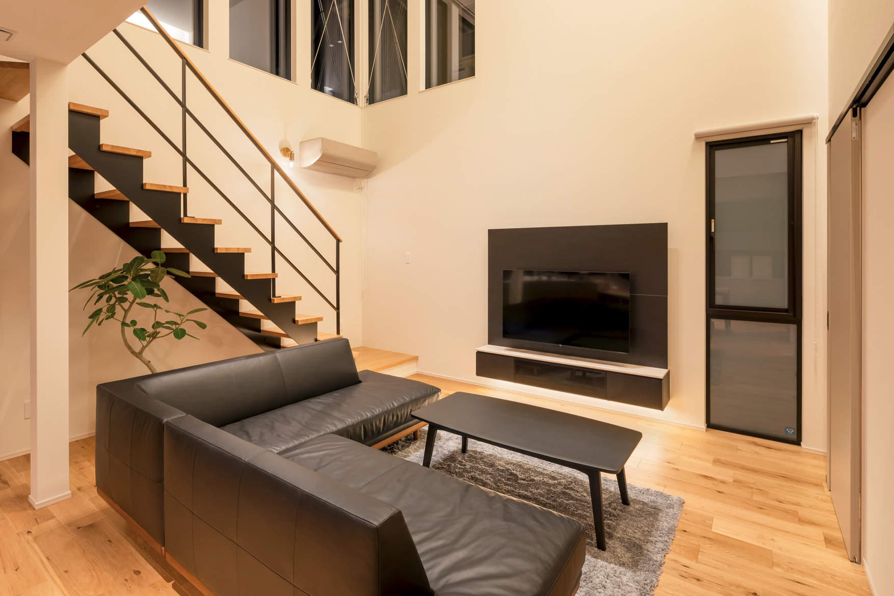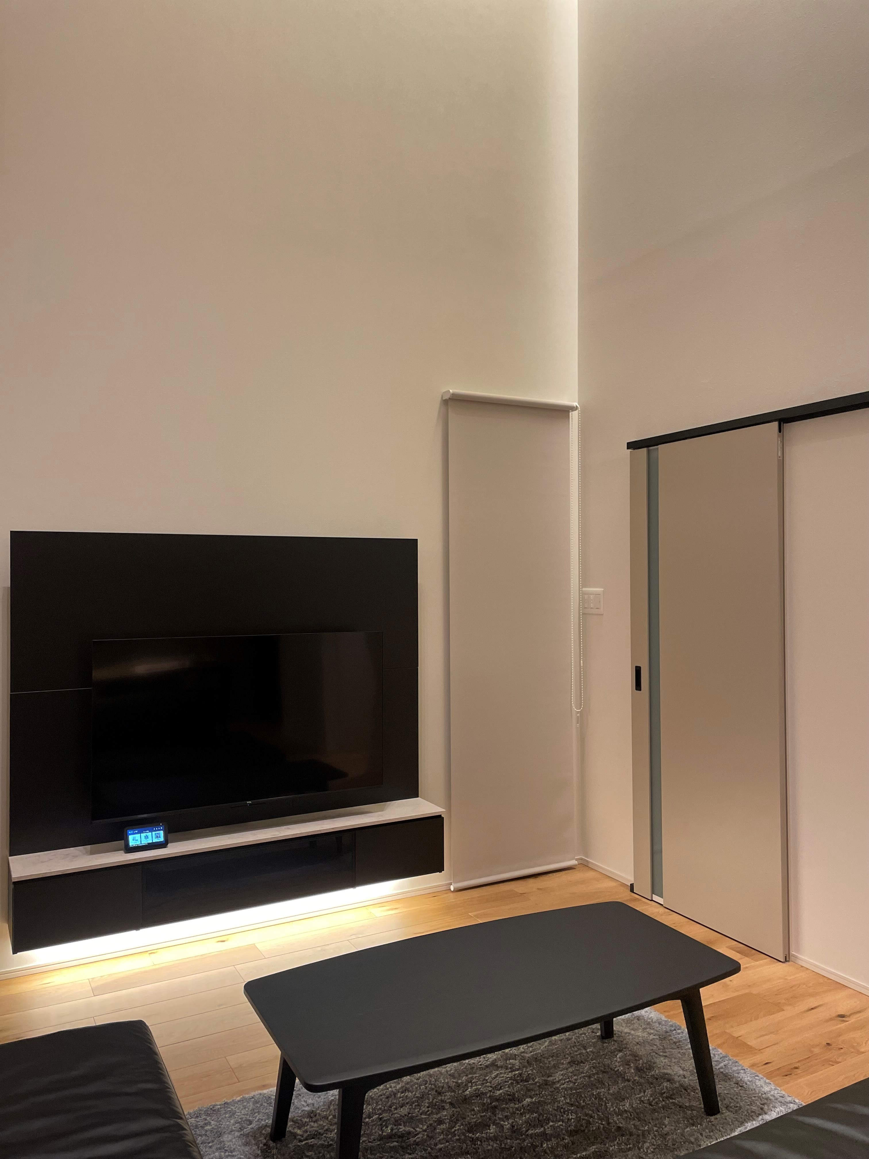 リビング吹抜には高光束のコーニス照明で、吹抜の明るさと高さ感を演出、テレビボード下に低光色の棚下照明で、くつろぎのあかりと組み合わせ空間のバランスを保っています。
