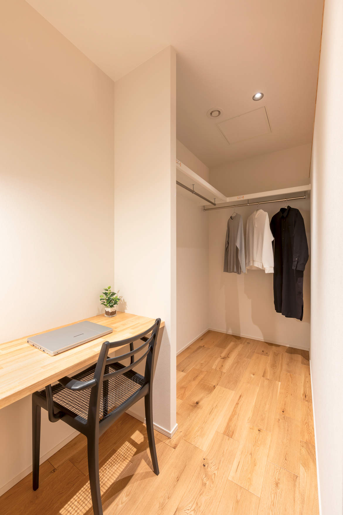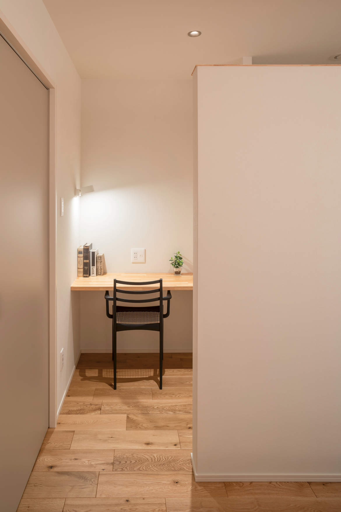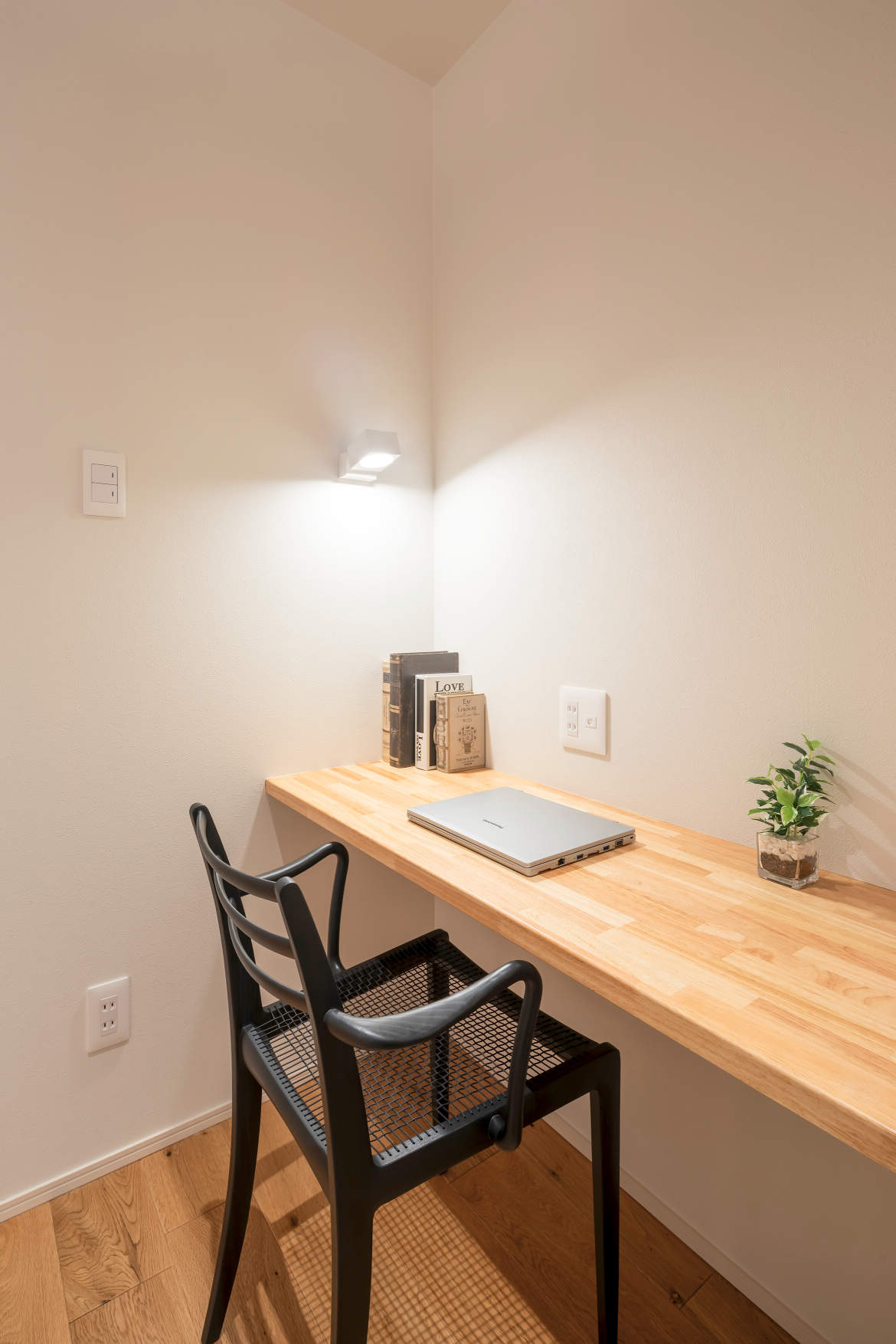 寝室横のカウンターデスクにはフラットランプ光色切替ランプを使ったスポットライトを設置しています。光の色や照射方向も自在に変えられるので、作業内容に合わせて自由にお使い頂けます。