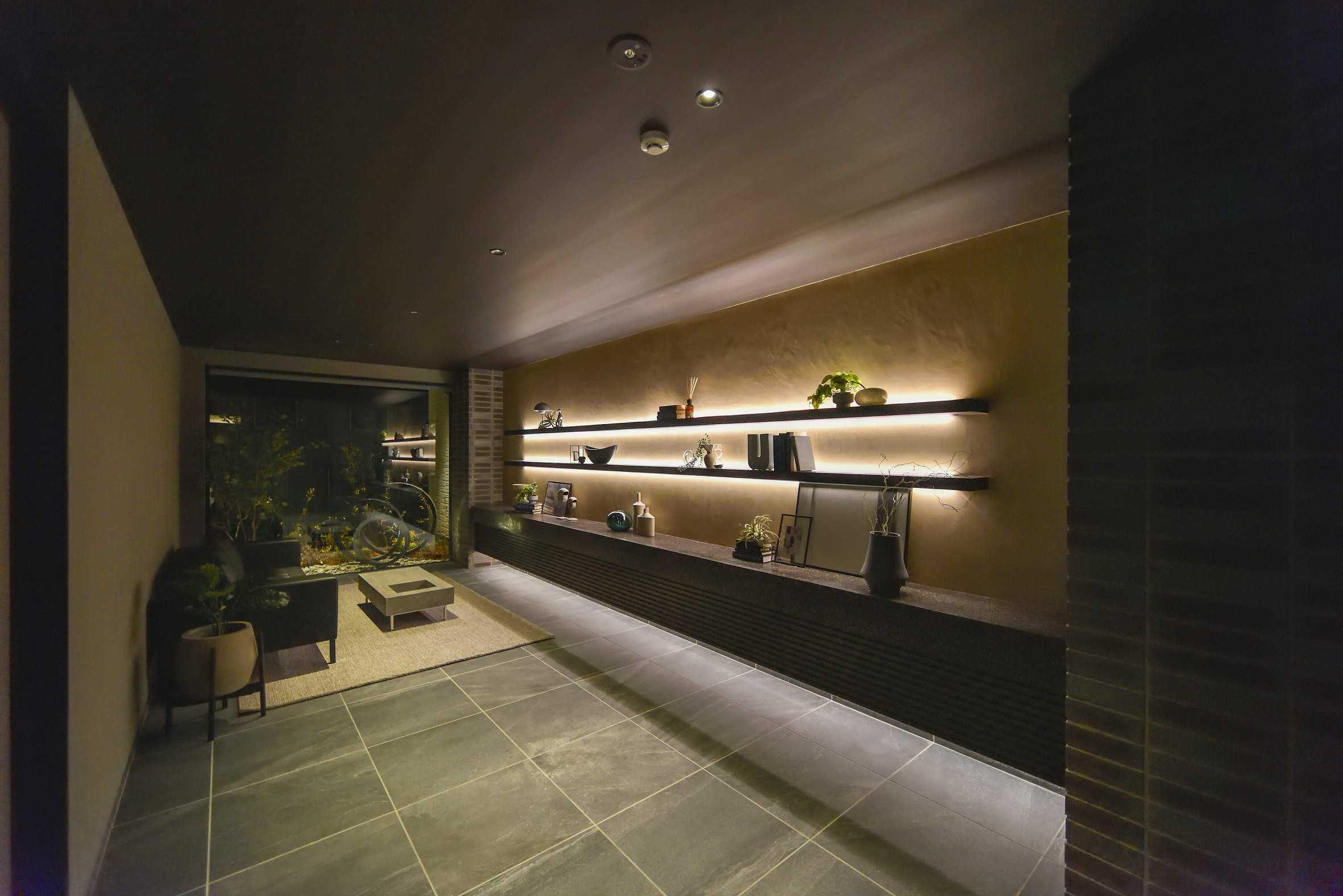 中庭を囲うベンチ下照明は調光タイプで程よい明るさに調整。