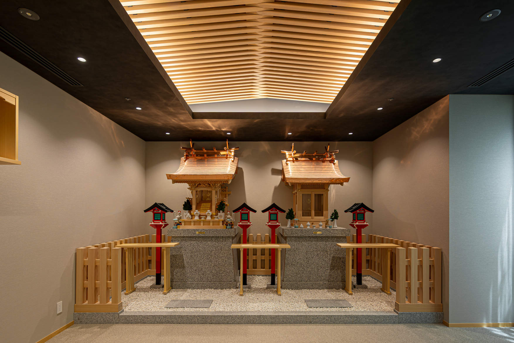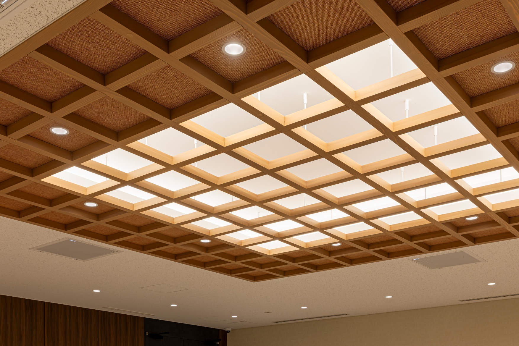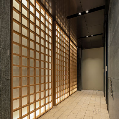 木格子の上部の天井を間接照明により柔らかく照射している。