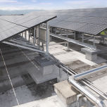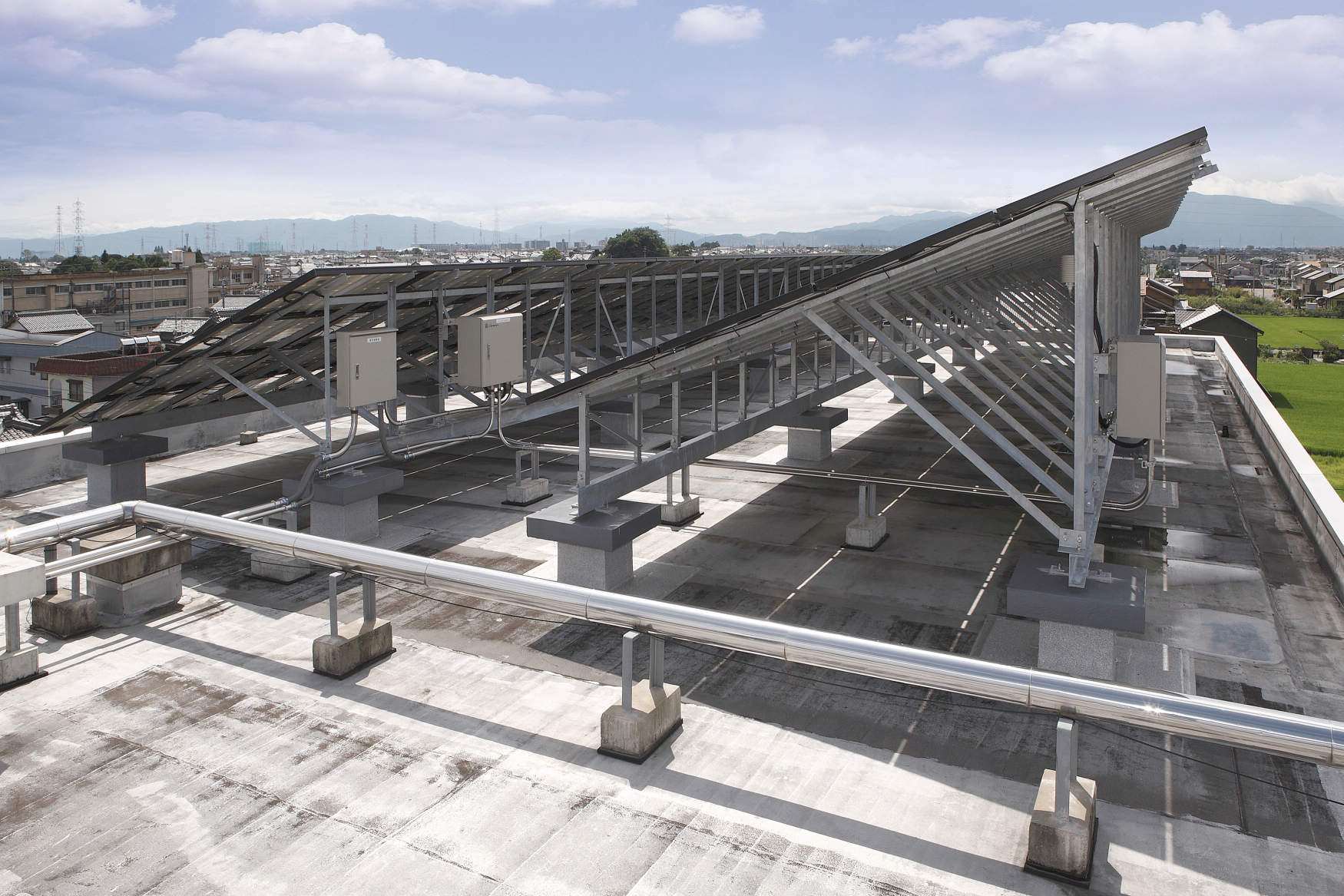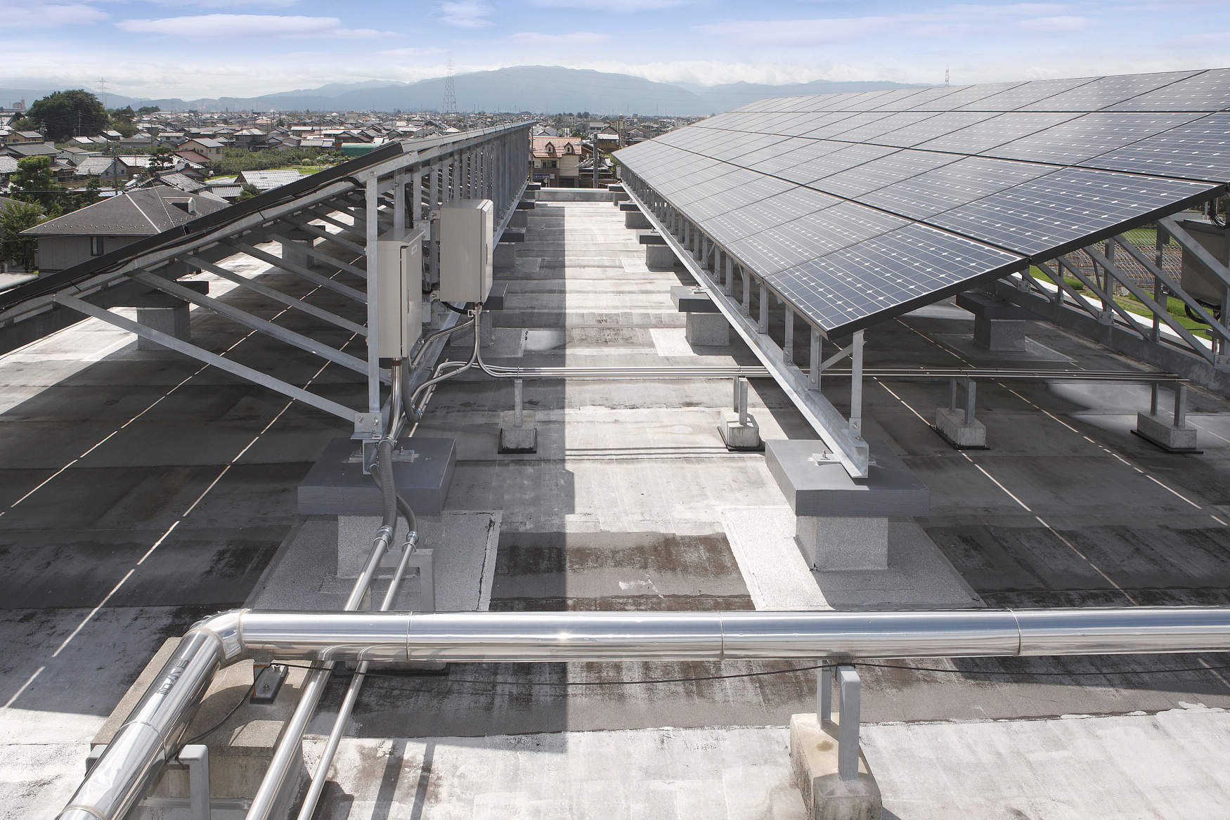 太陽光発電パネルは2列設置され、その間をステンレス配線保護管で配管しています。