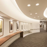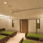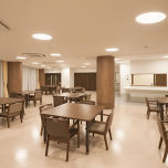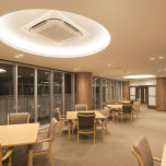 デイサービスの主要諸室である機能訓練室・食堂には、お年寄りが心地よく過ごせるよう、柔らかな光の間接照明を計画しました。その周辺に意匠性の高いソフトライトとペンダント照明をアクセントとして配置しています。