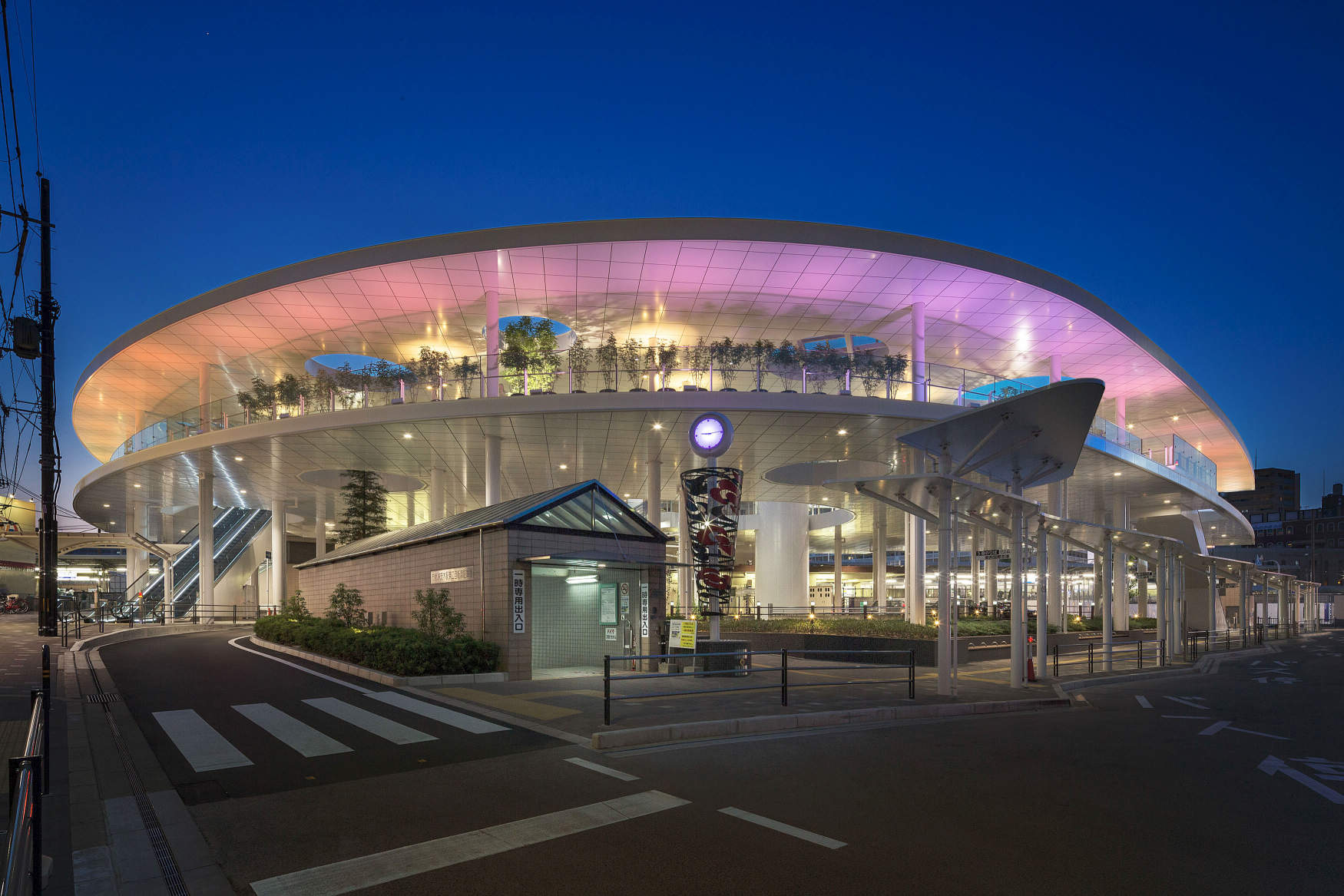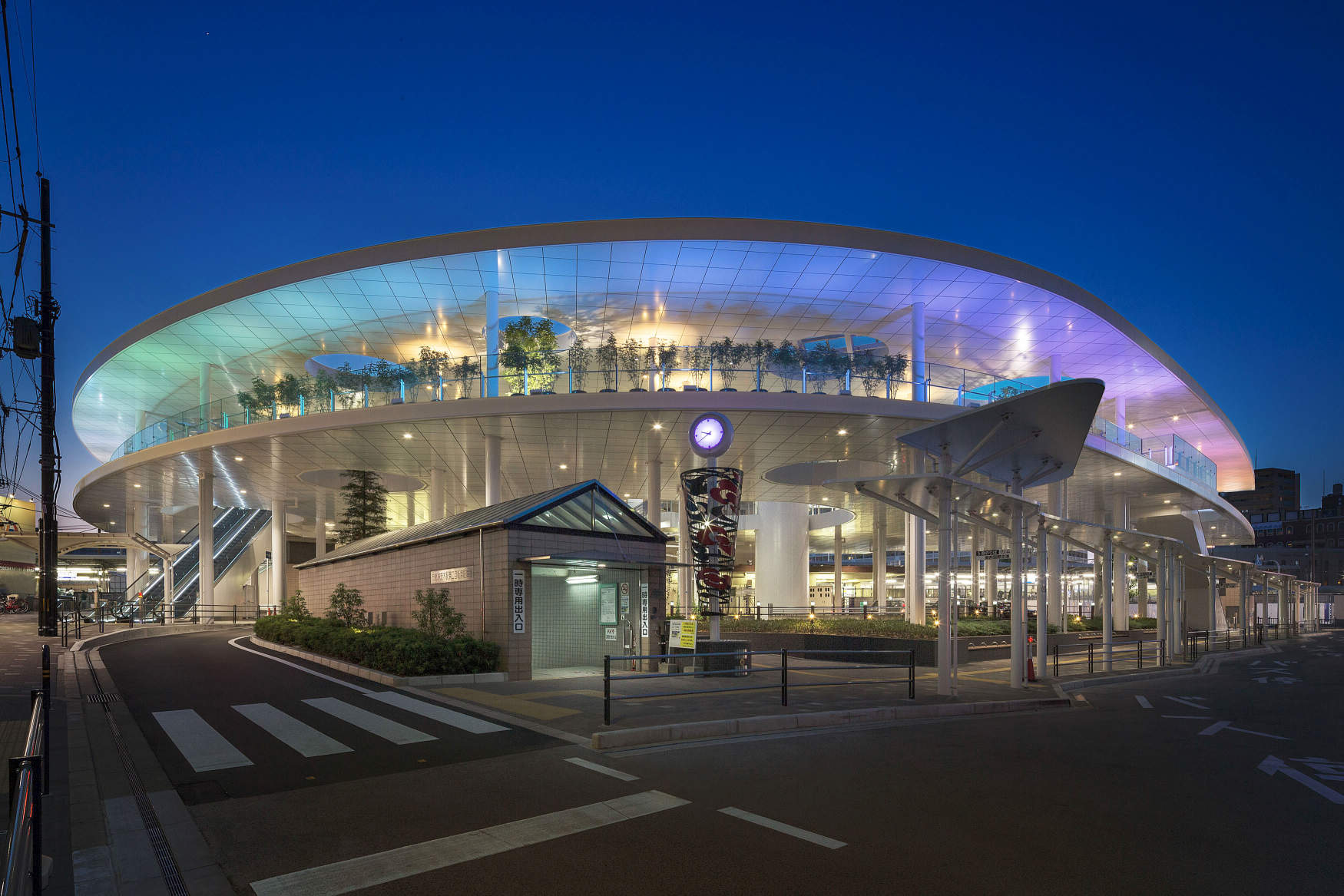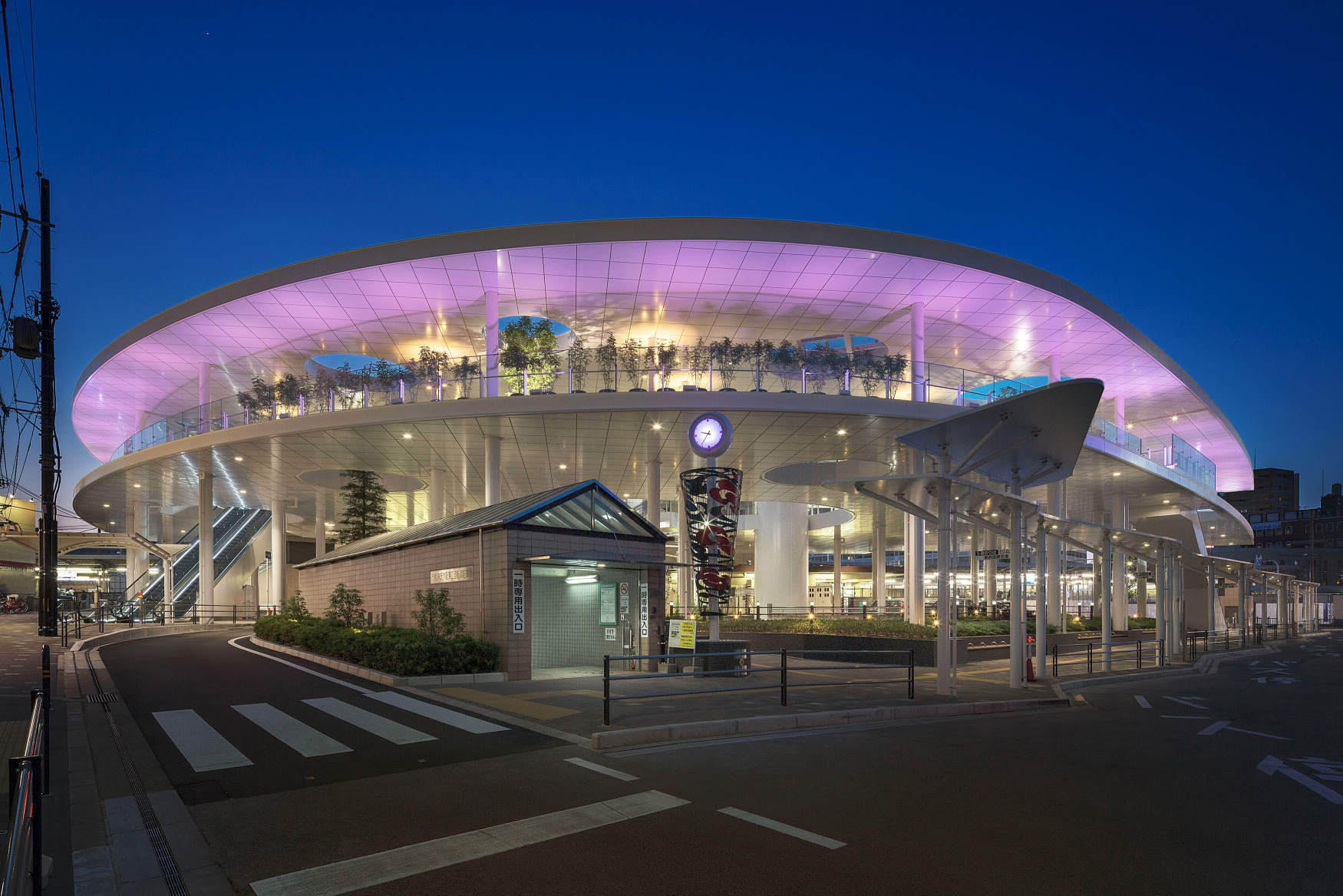 夜間はペデストリアンデッキ2階の雲をイメージした真っ白な大屋根をカラーライトアップし、駅前の新しいシンボルとして存在感を高めています。ライトアップは屋根の輪郭を強調するように周囲だけをフラットにライトアップされており、白を基本色に正時毎に5分間1日の空の色の移り変わりをイメージしたやさしいパステルカラーでライトアップし、時を演出します。