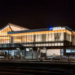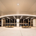 駅の南北をつなぐ自由通路は床面へ直接照射する照明を一切使わず、天井・壁面からの間接光のみで床面の照度を確保。天井や壁面の木材を明るく照らすことで“明るさ感”を高めており、開放的な雰囲気を生みつつ、あたかも木の隙間から日が差し込んでいるような、 「木漏れ日の駅」の象徴となっています。 また、天井や壁面の材料にヒノキ材や透明な膜材を採用したことで、照明だけでなく、日光による光も考慮することによって、時間に左右されない、一日中”ぬくもりのある・明るく開放的な空間“を実現しています。
