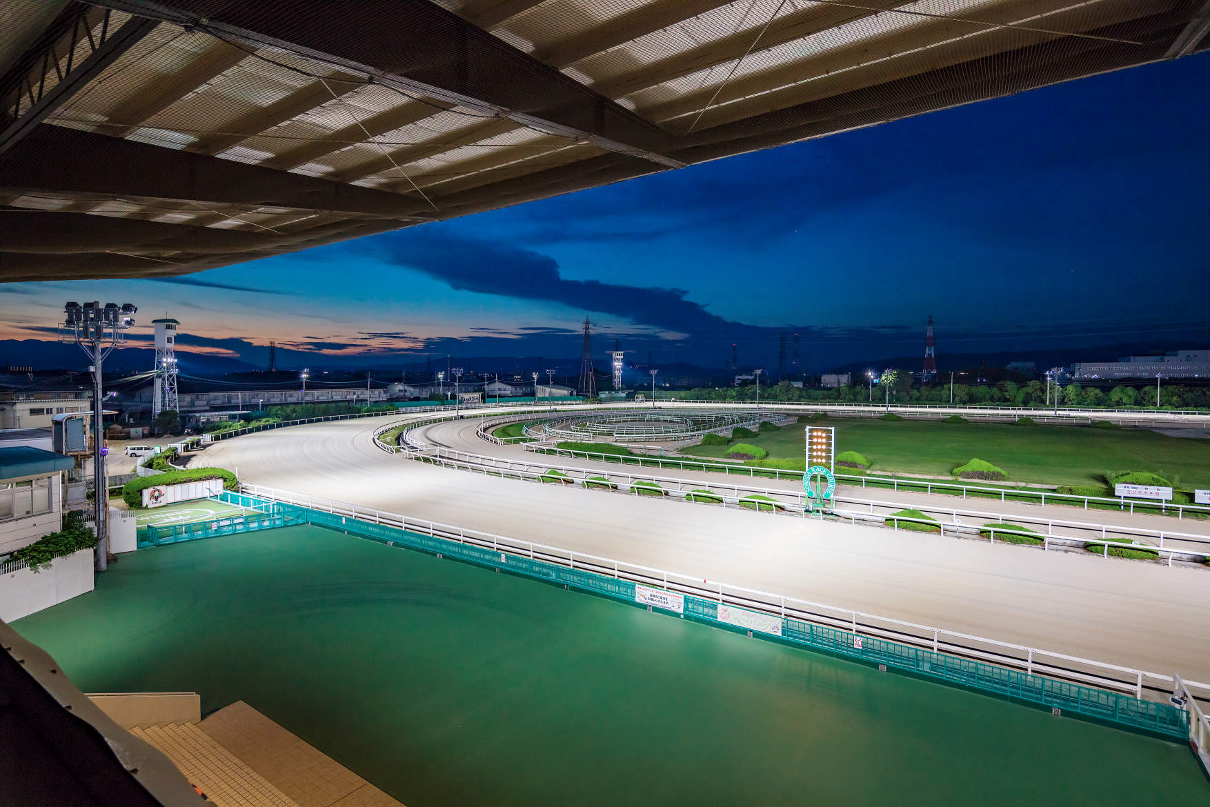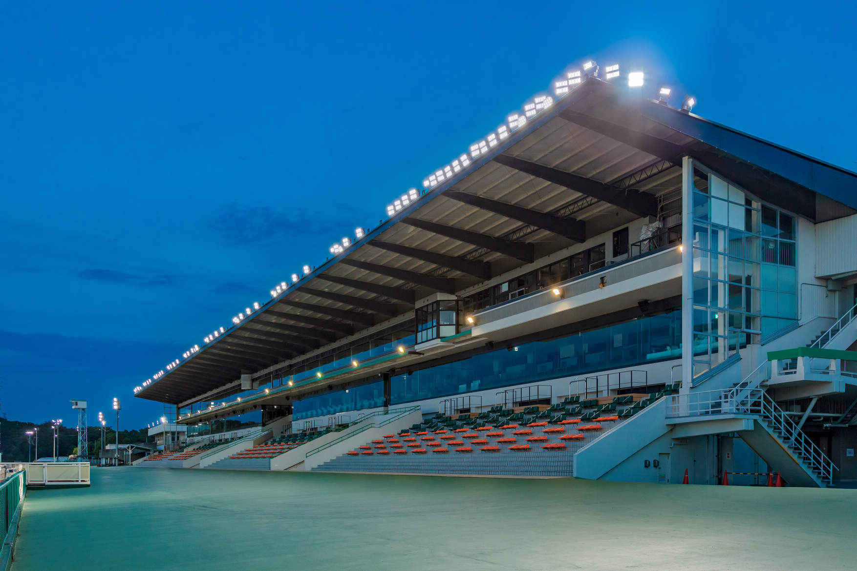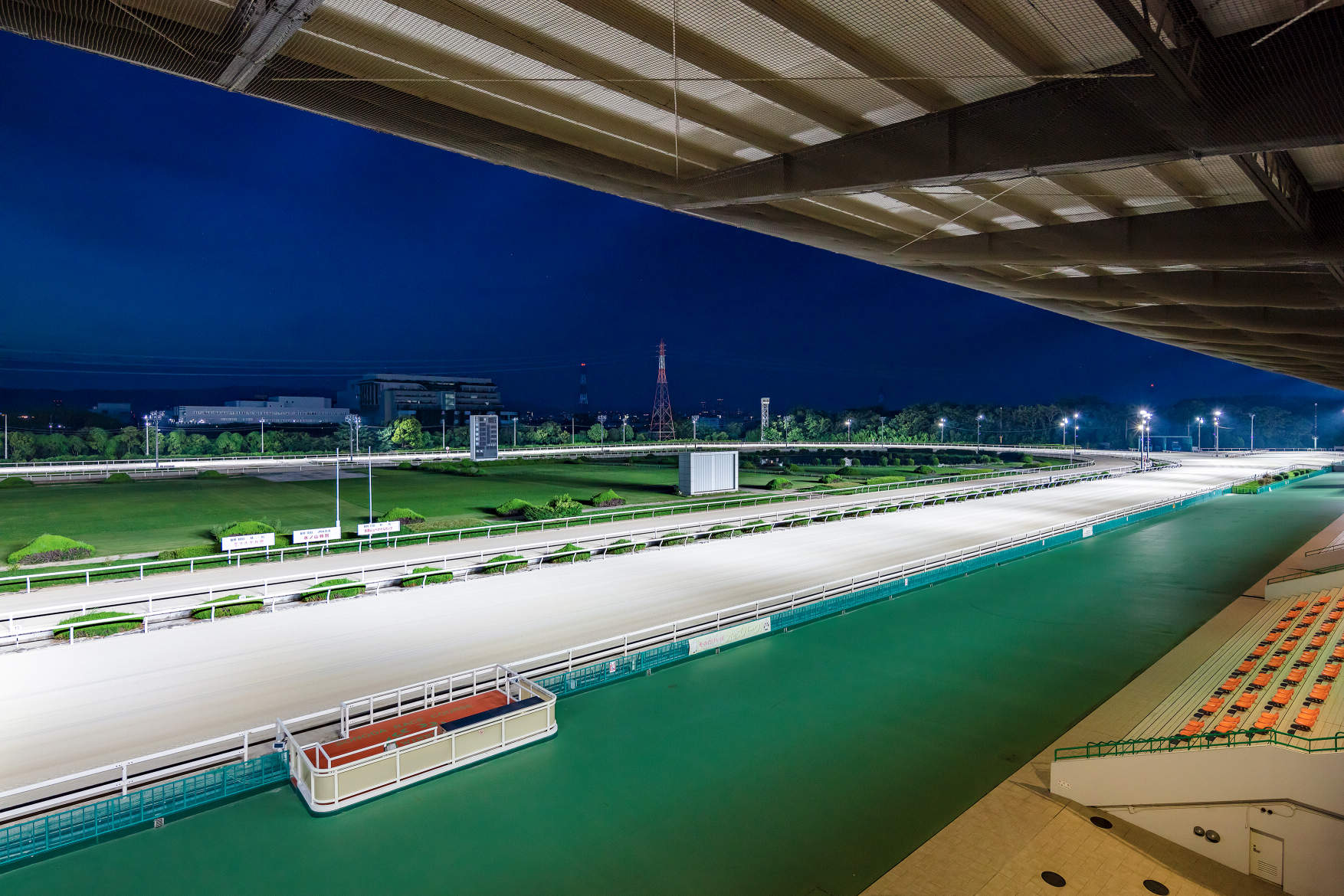 競馬場走路内に、スタジアムビーム投光器283台が設置。正面スタンド屋根及び、走路の内・外にコンクリート柱を配置し、各部を照射。コース全体平均700LX、正面スタンド側直線路・ゴール板前は平均1000Lx、コーナー部は500LXを確保しています。LED光源はRa80、色温度5800Kを採用し、TV放映時の演色性を向上させています。