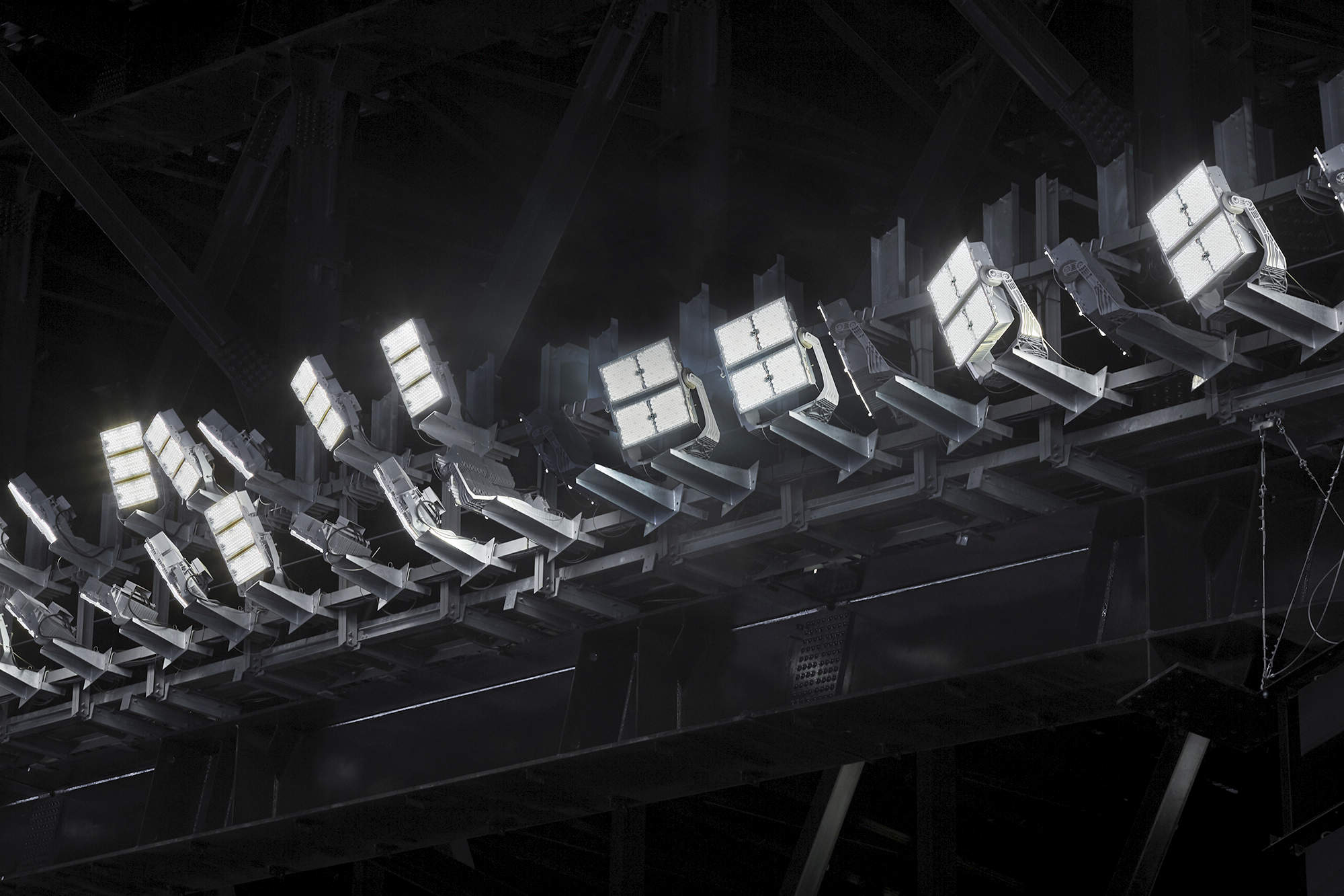 メインとなるフィールドは、LED投光器354台にてプロ野球公式試合にふさわしい照度を確保しながら選手の眩しさに配慮した「プレイヤーファースト」な照明環境となっています。可動式の屋根や世界最大級のビジョンを持つな唯一無二の複雑な建築により、照明器具設置位置に大きな制約があるなか、VRにて事前にシミュレーションし、適切な照明配置とエーミングを実現しています。