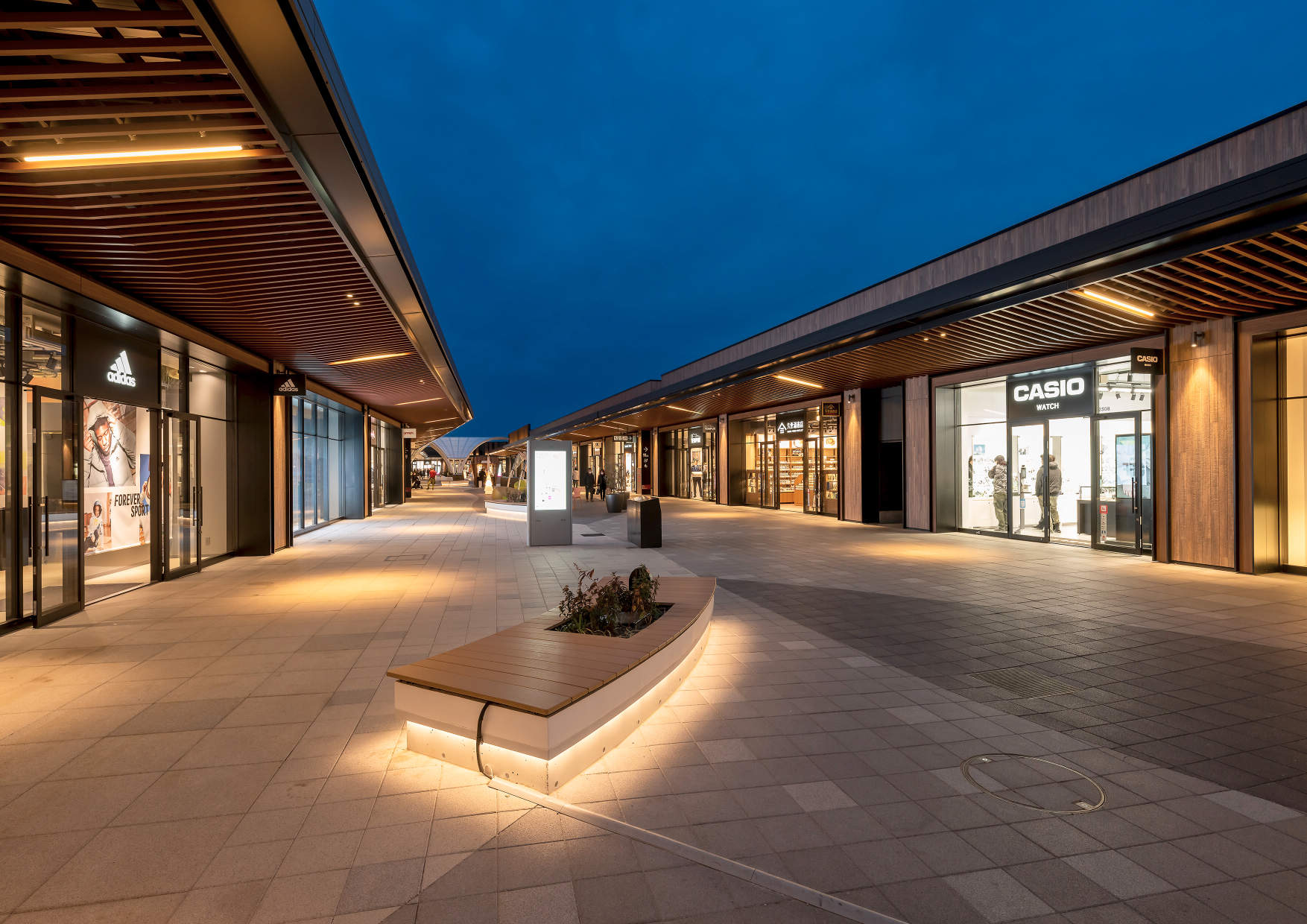 店舗入り口やベンチ周囲など、人が集まる・留まる部分に光を集約させる計画としており、軒下はエリアによってライン照明の配置方向を変え、空間にアクセントを持たせています。