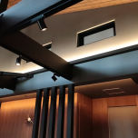 ダウンライトでテーブル面の手元を明るくしつつ、スポットライトで壁面に光をあてています。
