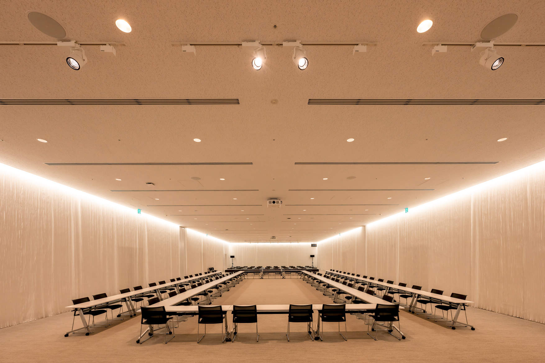 最大600枚収容の大会議室。白で統一され、柔らかく落ち着いた雰囲気を醸し出している。
