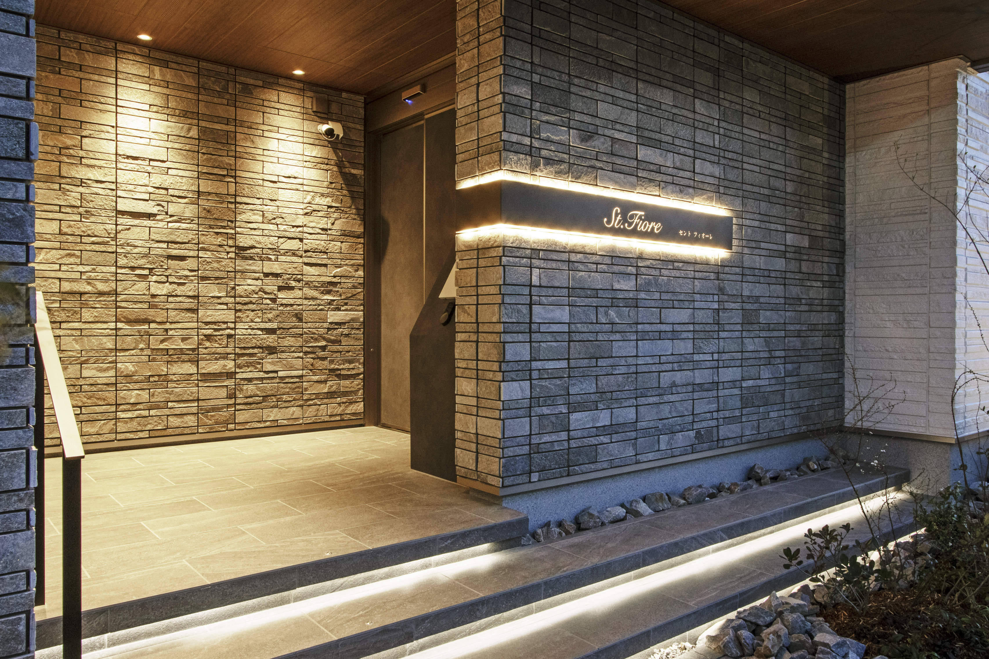 エクステリアには眩しさを抑えたソフトグレアレスダウンライトを採用。