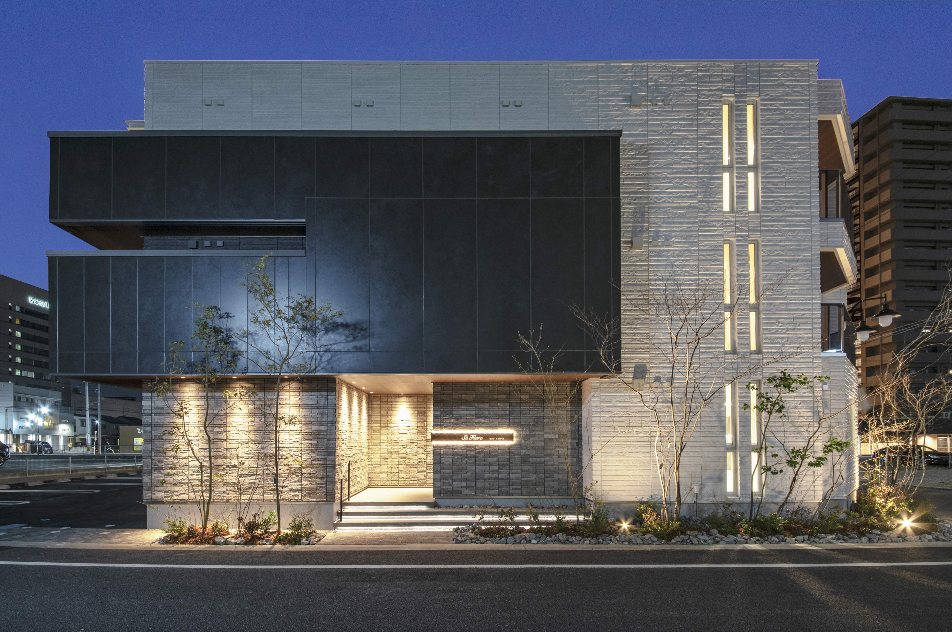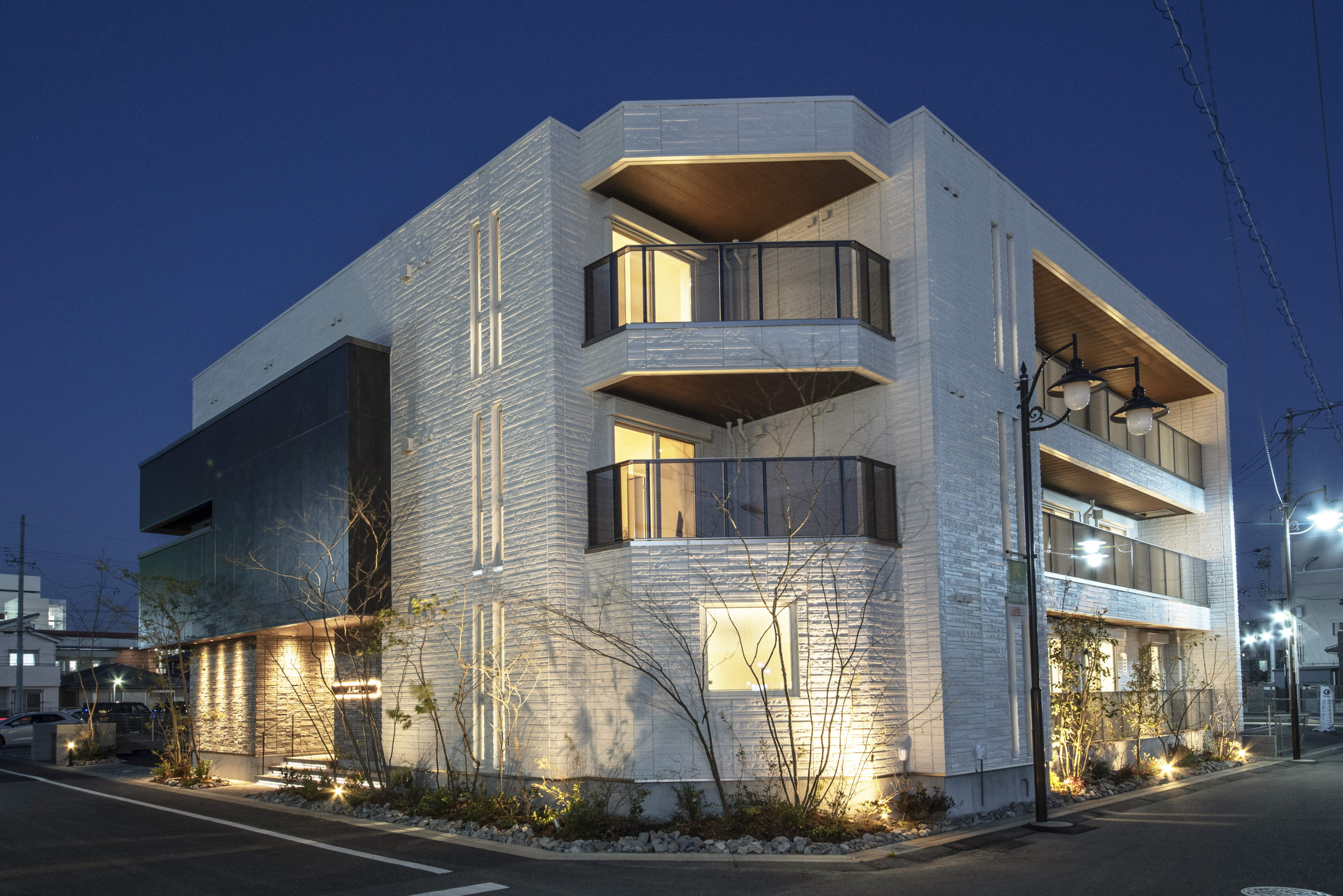外壁のライトアップには中角タイプを使用し目を惹く外観に。