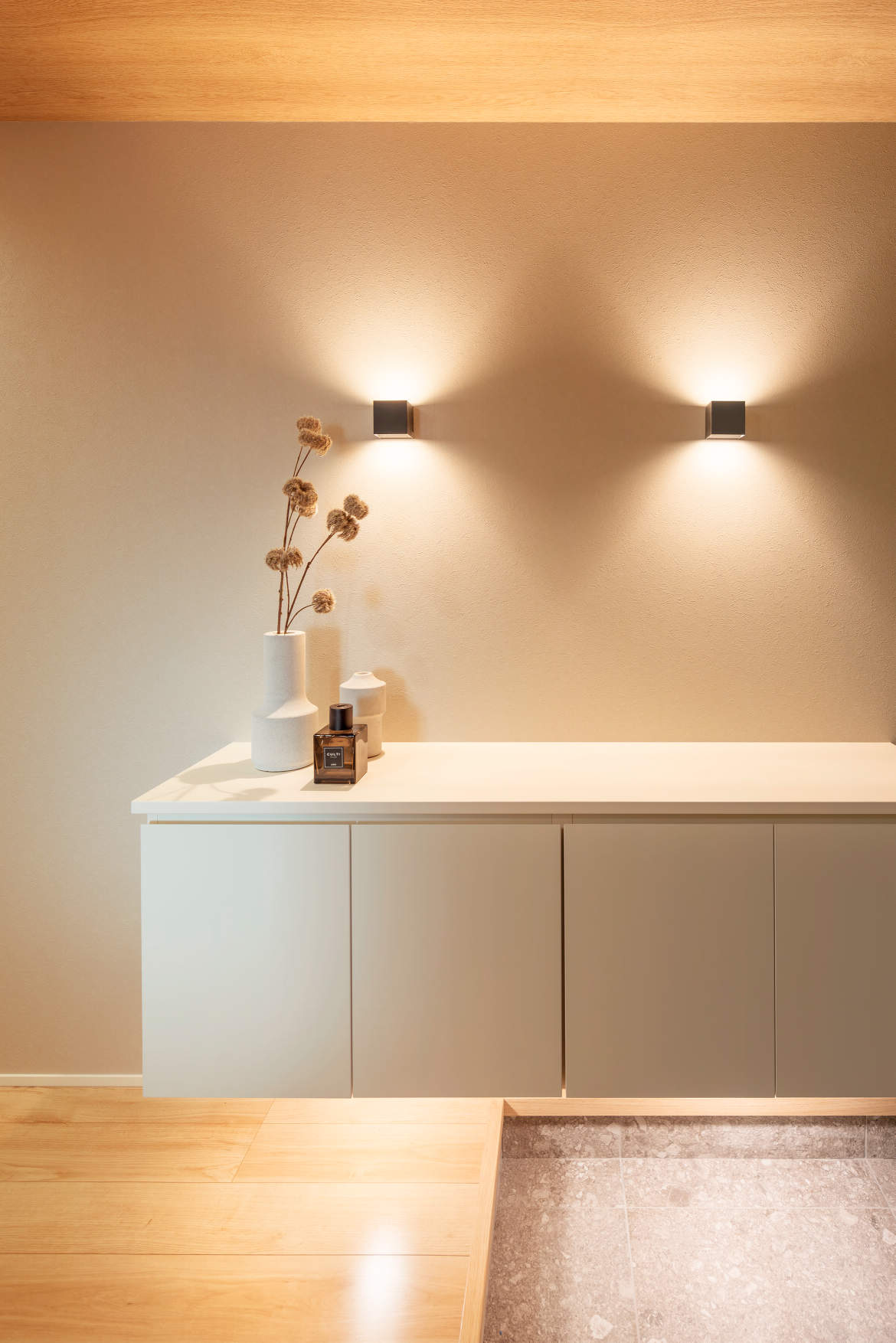 木質天井の玄関にはダウンライトを入れず壁のブラケット2灯で明るさを確保しています。