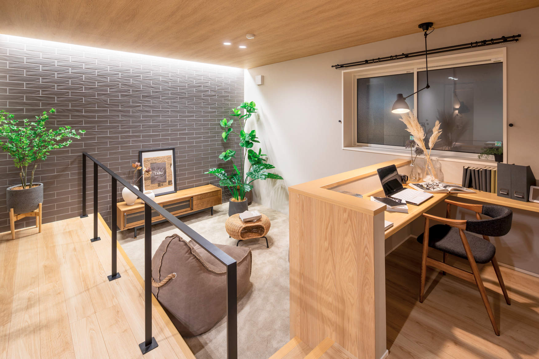 ダウンフロアになったリビングは、コーニス照明でタイル壁を引き立てています。