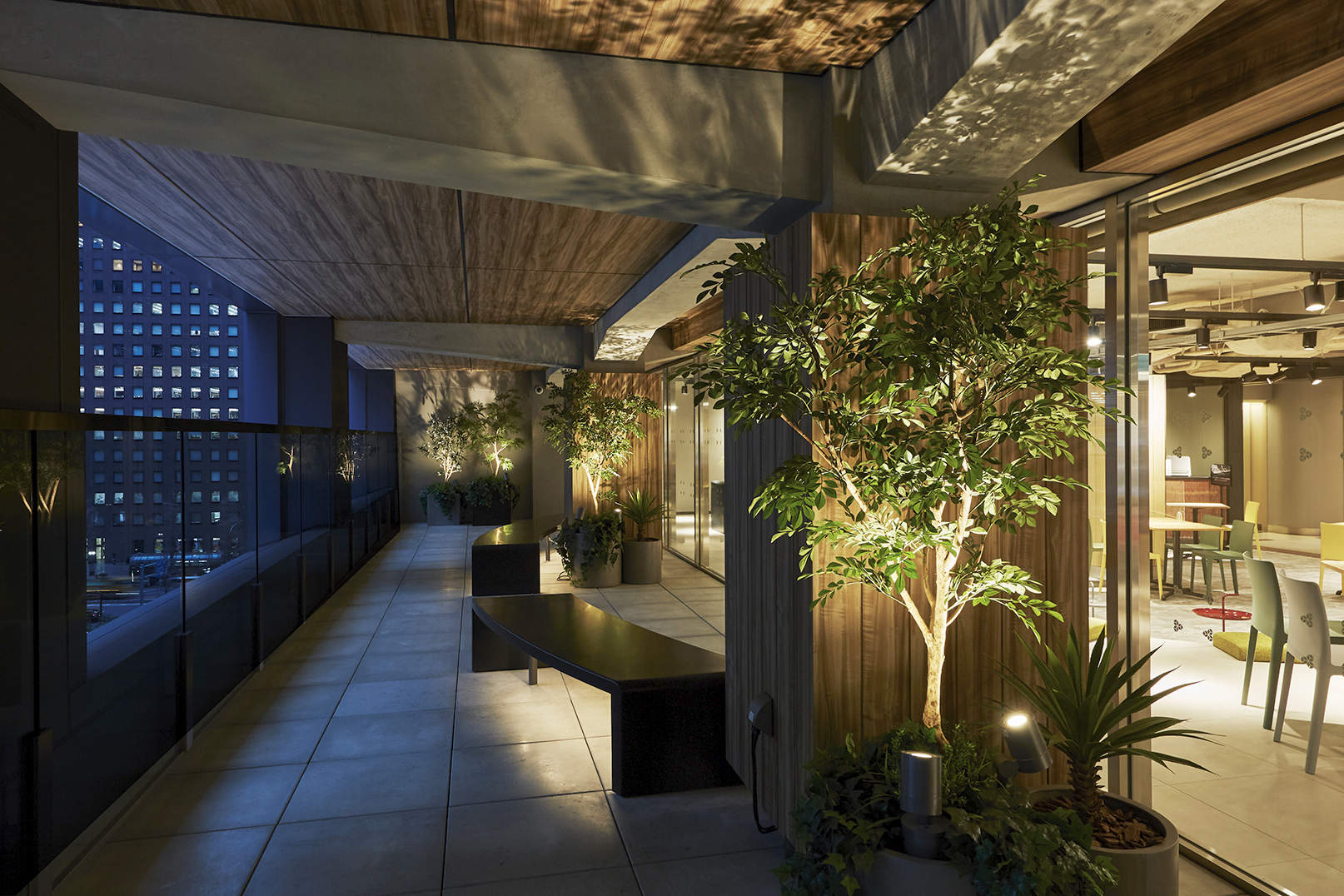 南ラウンジには仲通りを見渡せるテラスがもうけられ、夜間ではベンチ下の間接照明、植栽ライトアップによりドラマチックな空間を演出しています。