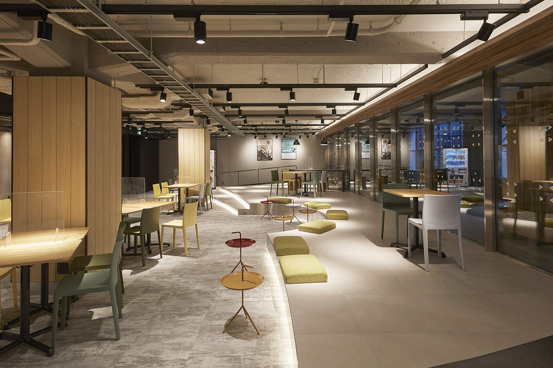 ラウンジはEVホールを中心に南北に分かれており、スケルトン天井のファクトリー感のある空間にリニューアルされ、配線ダクト+調光型スポットライトによる陰影感のある落ち着いた光空間になっています。足元には間接照明があしらわれ、空間にアクセントをあたえています。
