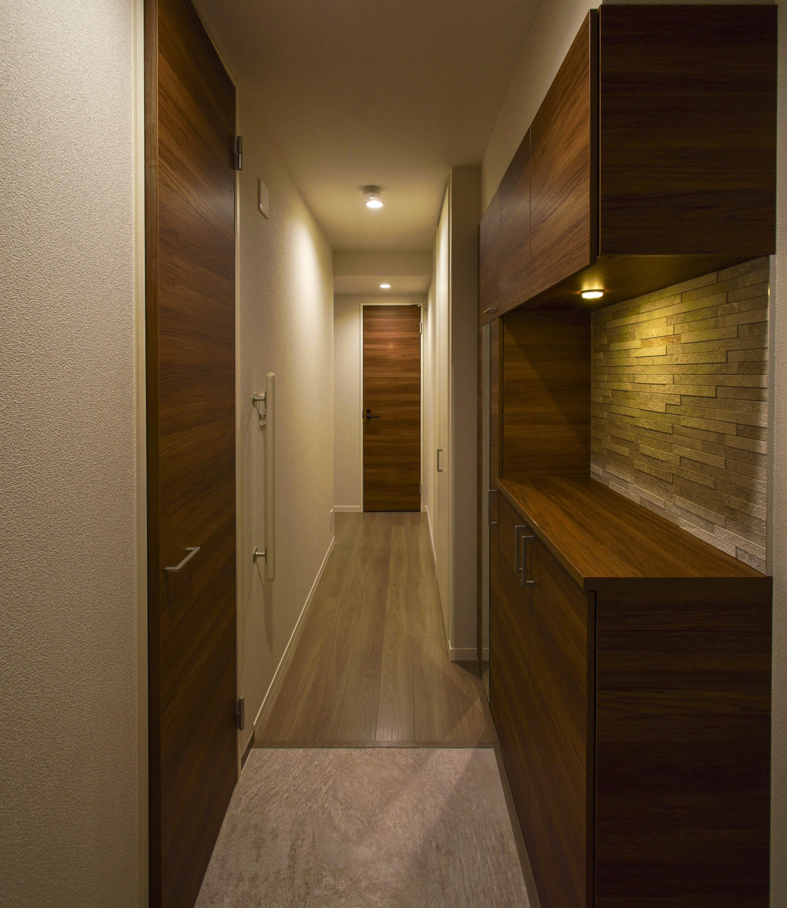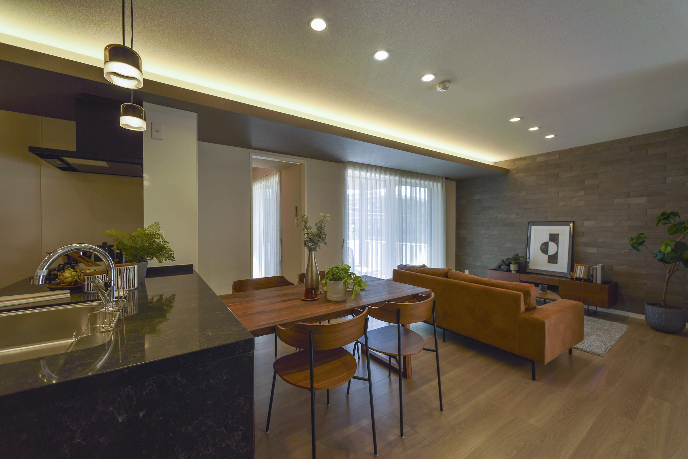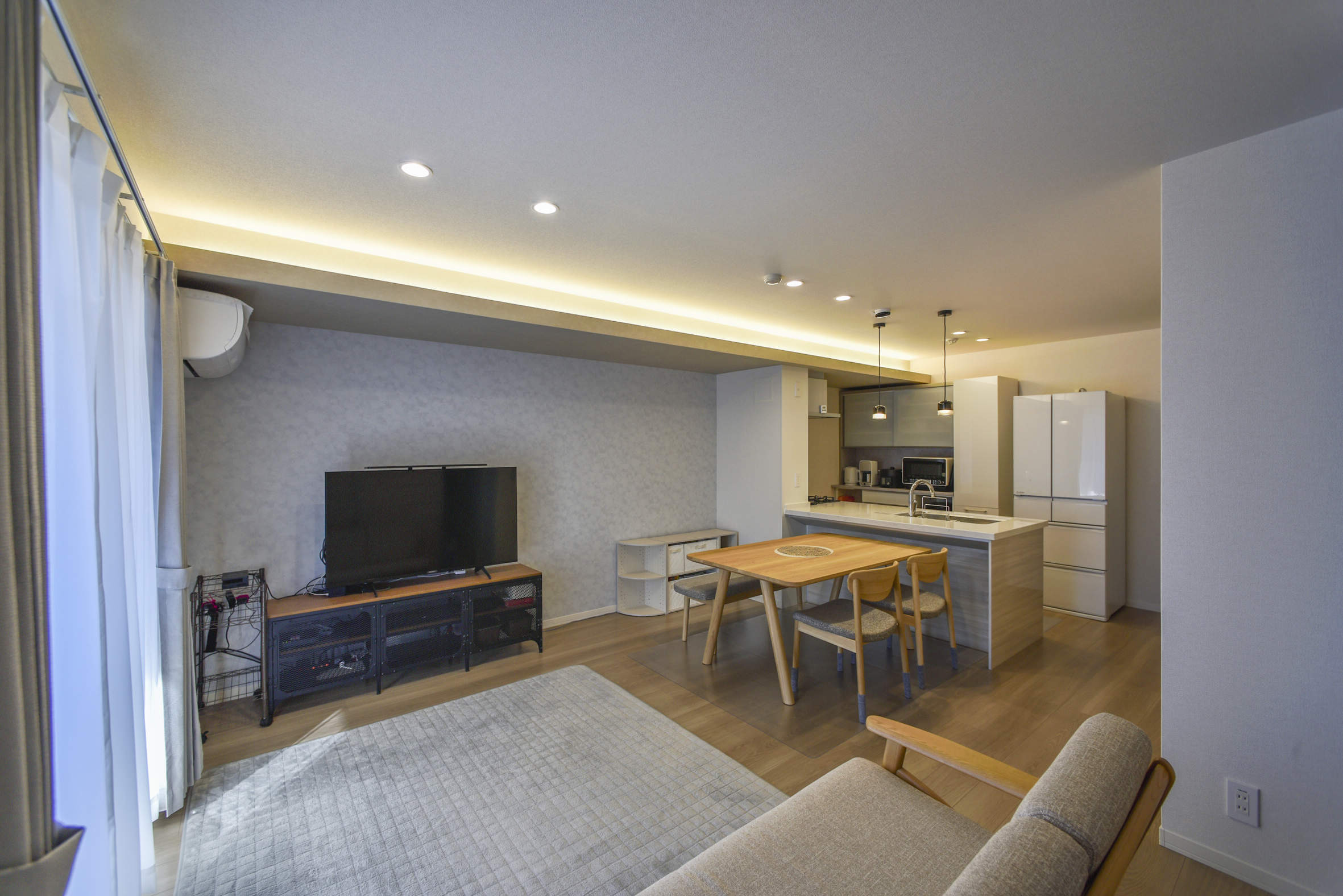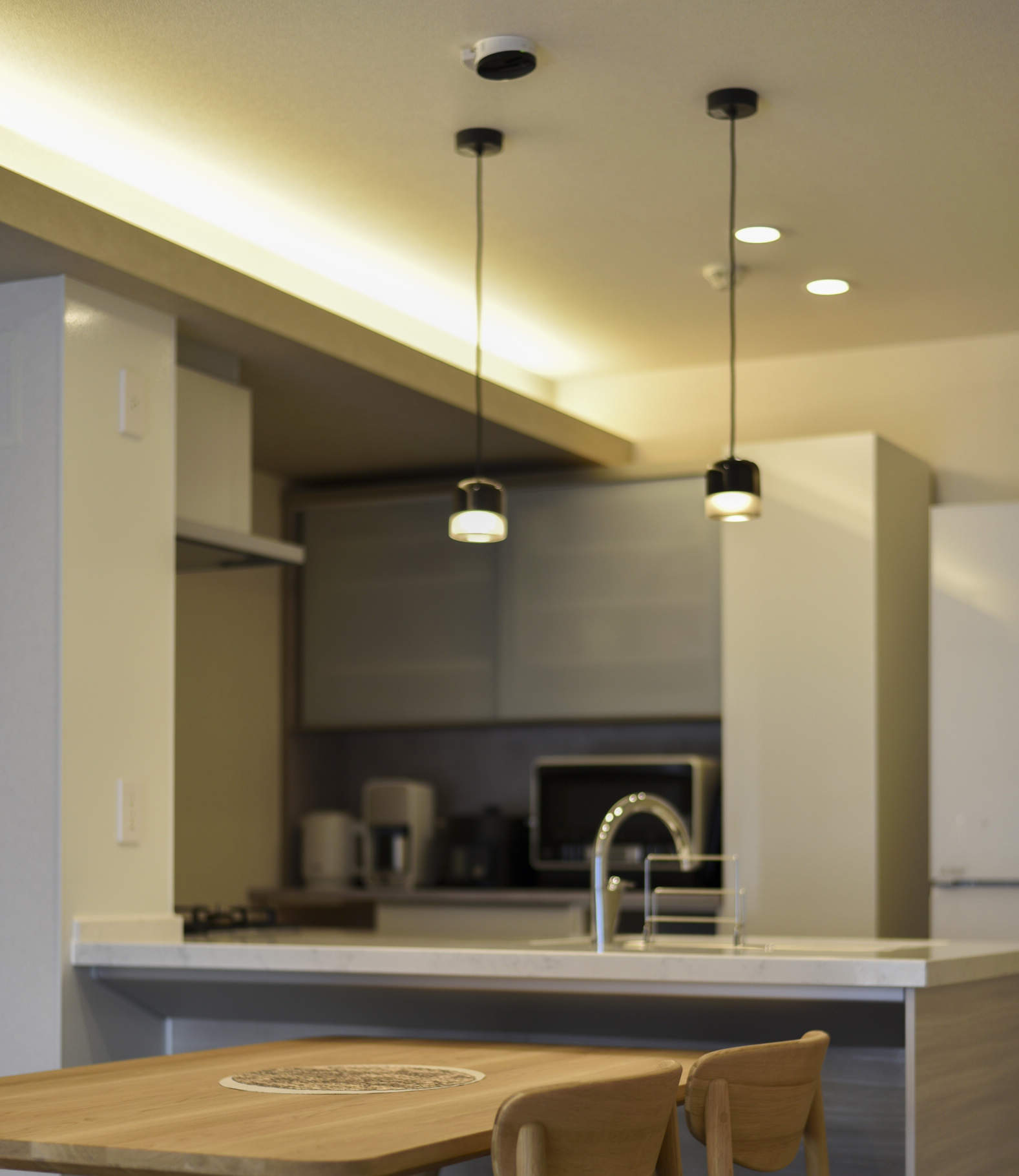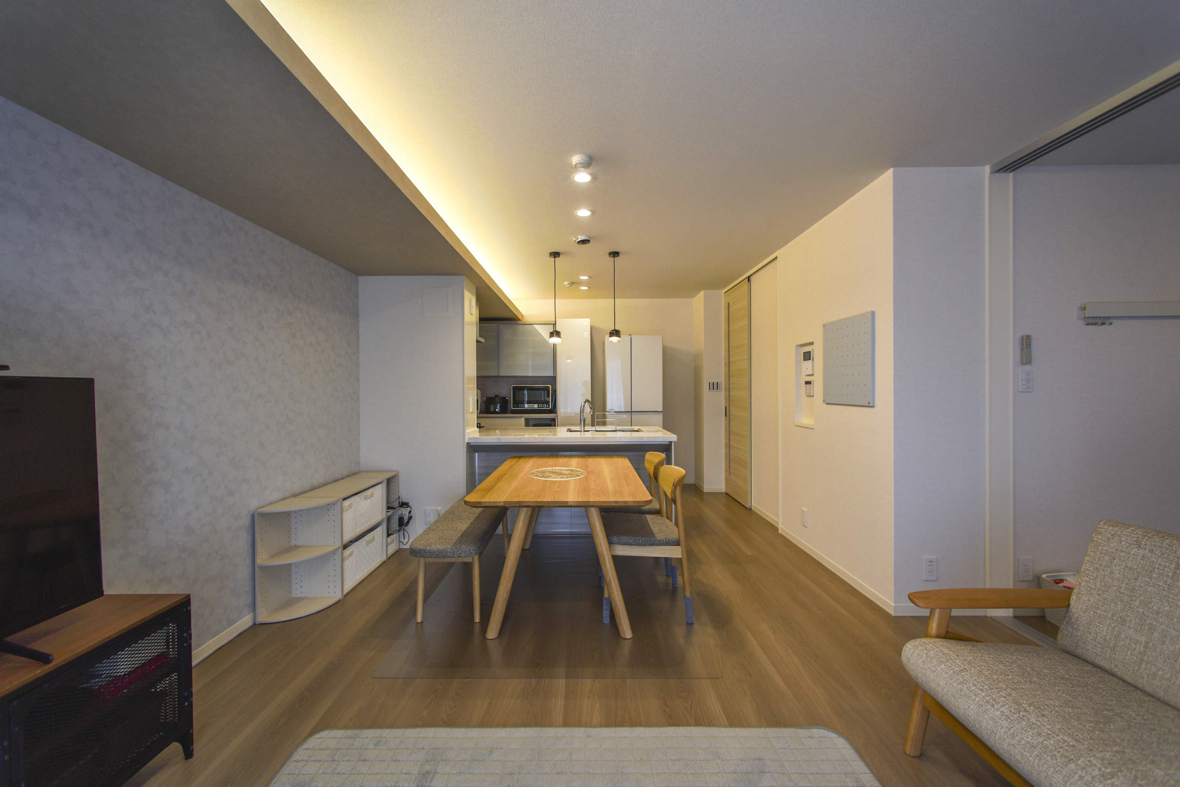 住戸部はダウンライト・コーブ照明・ペンダントを温白色で統一。