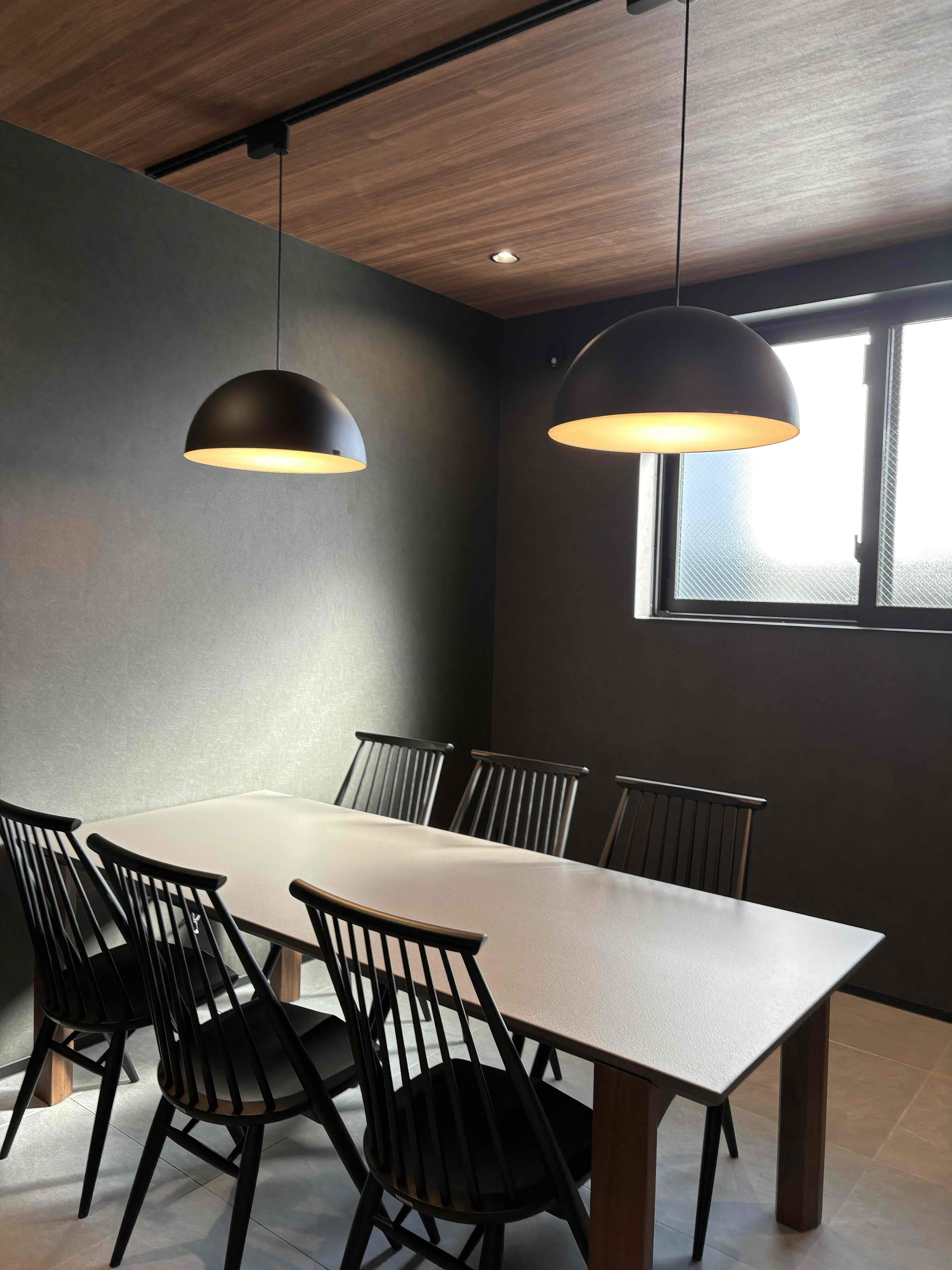 濃い木天井にはダクトレールにMODIFYのペンダントを吊り