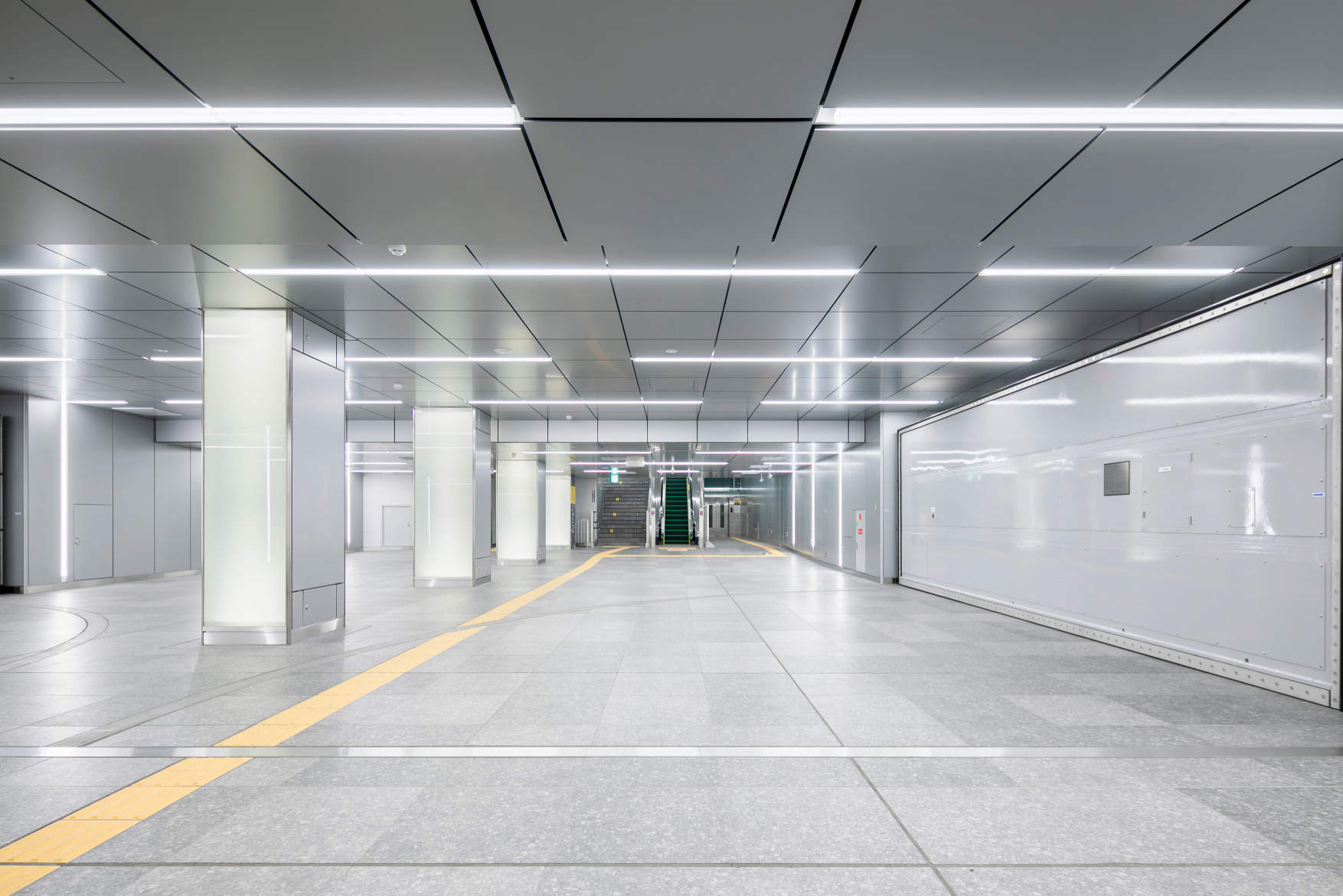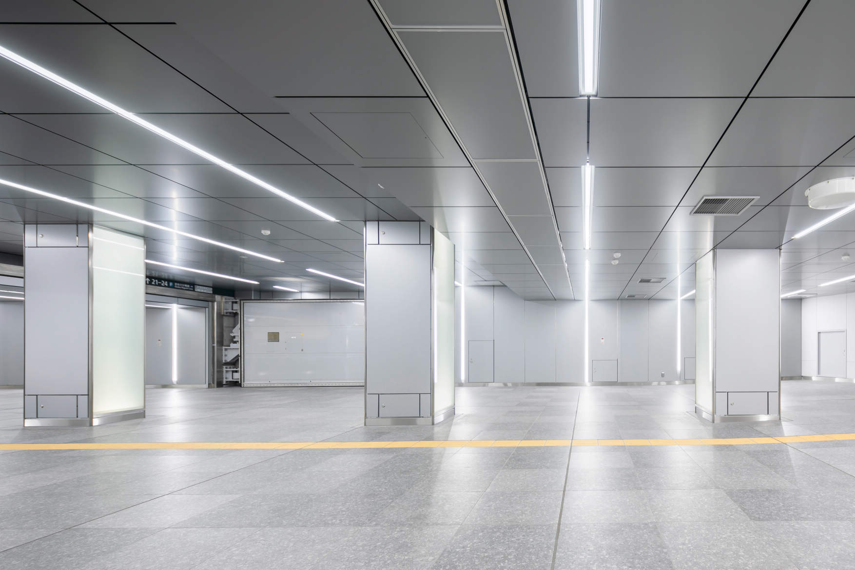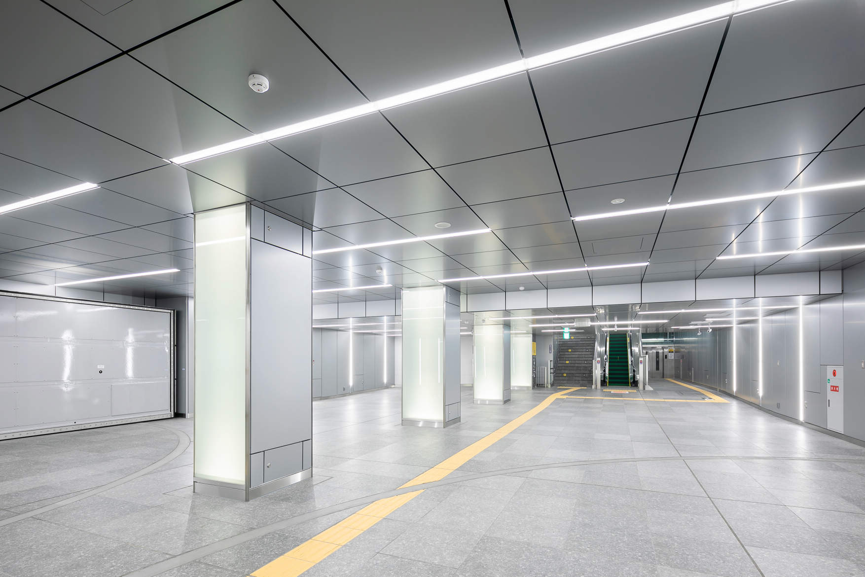 今回開業した大阪駅うめきた地下駅と従来の地上駅である大阪駅を改札内で結ぶ地下連絡通路で殺風景な空間をスリムラインで天井、壁にランダム配置することで明るさ感のある空間としています。