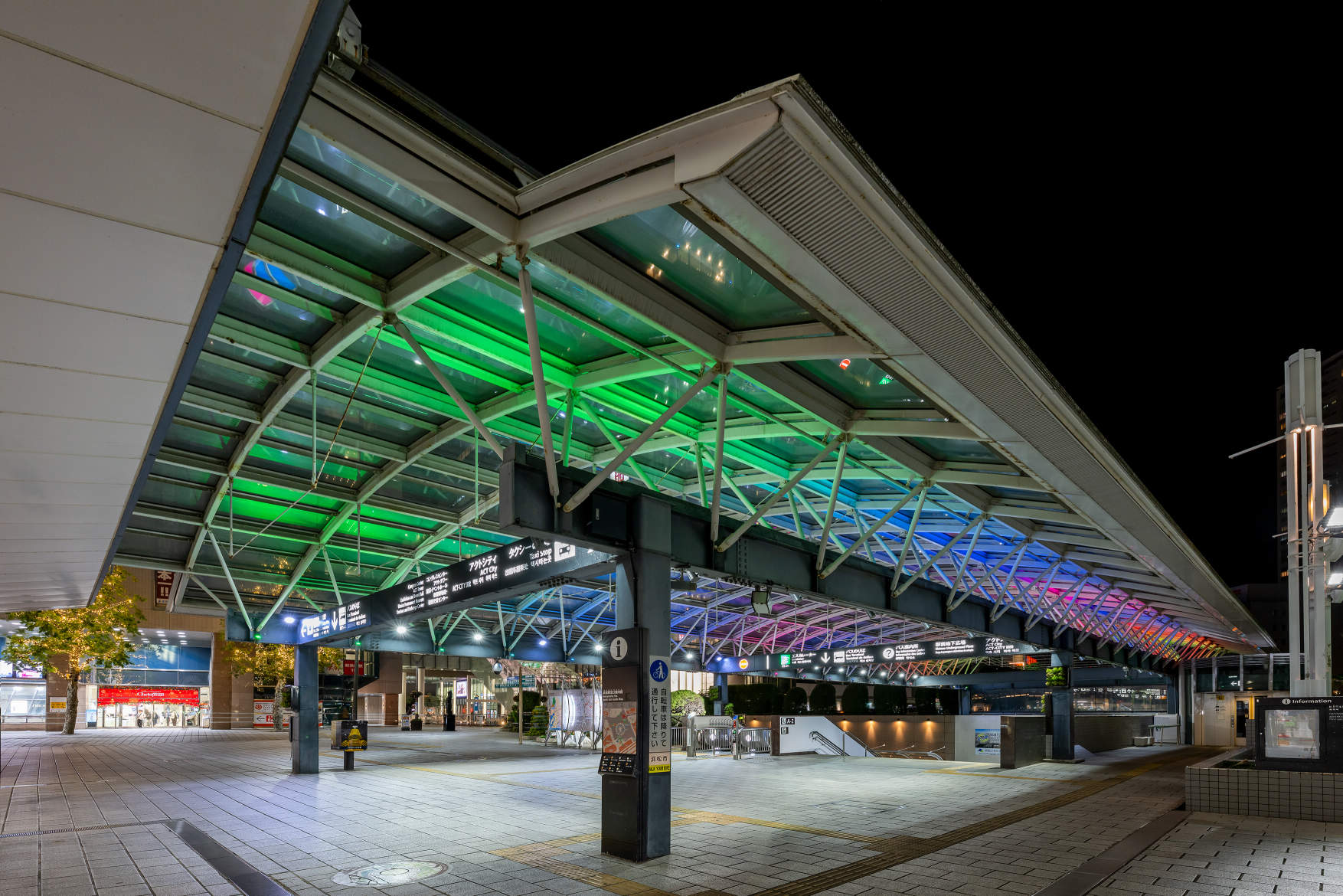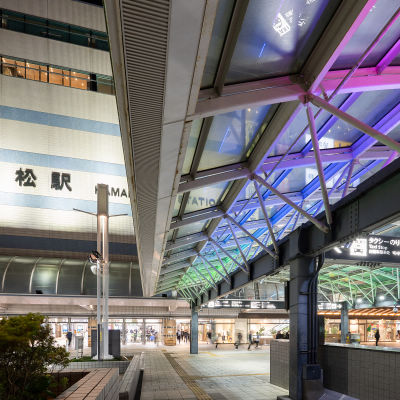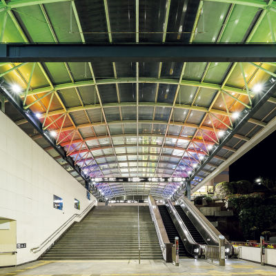 駅ビルに直結するアーチ形の通路にアーキライン76台とDMXスポットライト41台を配置し、天井面を照らしています。