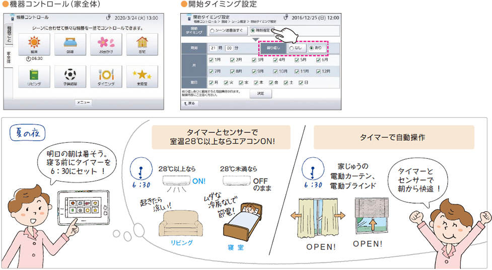 AiSEG2につながるさまざまな機器のそれぞれの状態を、在宅や外出といった生活シーン、または部屋ごとにまとめてコントロールできます。日常的に操作する生活シーンを繰り返し設定すると、以後設定した時刻になると自動でシーンを起動します。また、タイマーとセンサー※1が連携して室内の環境を自動で快適にコントロールします。