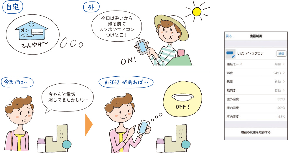 AiSEG2対応エアコン※1の場合は、宅外からエアコンのオフもできるのでムダなく節電できます。
