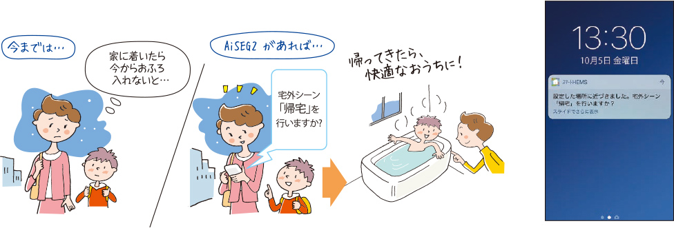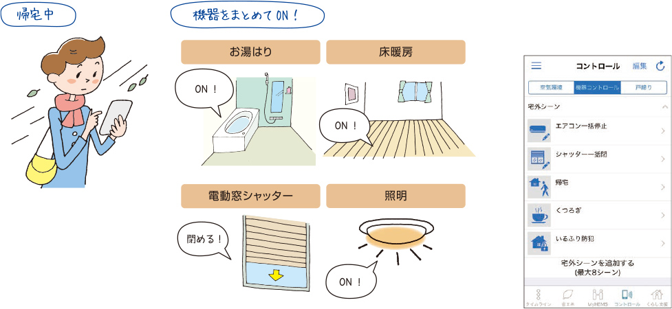 お風呂のお湯はりや、電動窓シャッターの開閉、エアコン、床暖房や照明のON、OFFなど、外出先からあらかじめ個別制御できる機器をまとめて操作できるので、帰宅後すぐに快適に過ごせます。