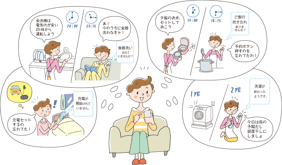 食器洗い乾燥機※1や洗濯機※1、炊飯器※1、電気自動車普通充電設備※2が設定した時刻に運転・充電開始されていない場合、プッシュでお知らせしてくれます。電気代の安い時間帯に家電の運転や電気自動車の充電開始ができるので光熱費削減※3をサポートします。また、洗濯機と電気自動車の運転・充電終了もお知らせします。洗濯機の場合、当日の天気予報も同時にお知らせしてくれるので、外干しと部屋干しのどちらがよいか判断できて便利です。