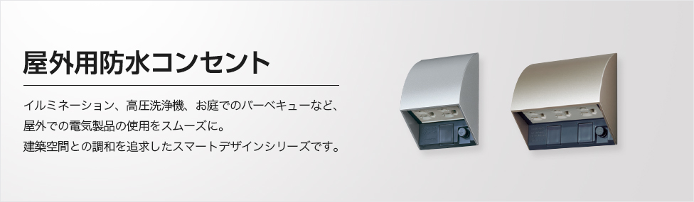 屋外用防水コンセント イルミネーション、高圧洗浄機、お庭でのバーベキューなど、屋外での電気製品の使用をスムーズに。建築空間との調和を追求したスマートデザインシリーズです。屋外用防水コンセント イルミネーション、高圧洗浄機、お庭でのバーベキューなど、屋外での電気製品の使用をスムーズに。建築空間との調和を追求したスマートデザインシリーズです。