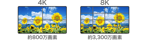 現行のハイビジョン(200万画素)を超える、4Kは4倍の約800万画素、8Kは16倍の約3,300万画素の超高精細な画質による放送です。
