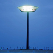 広面積のグラウンドなどを効率よく照射高所に投光器を集中設置することで、広面積のグラウンドなどを効率よく照射する照明方式です。 |