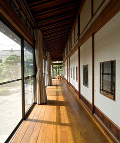 住宅は、東西に延びて南側の庭園に面する入母屋造り土瓦葺きの和風主棟(240?u)と、東南隅に建つ寄棟造りスレート葺きの洋館(105?u)をつなぐように東面中央に玄関を配したL字型平面の木造平屋建て。大工棟梁は不明ですが、細部にわたる意匠は当時の繁栄ぶりをもの語り、豪商の趣味と勉強熱心な棟梁とが生んだ傑作と言えます。